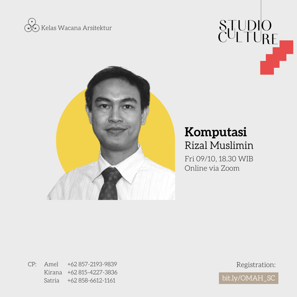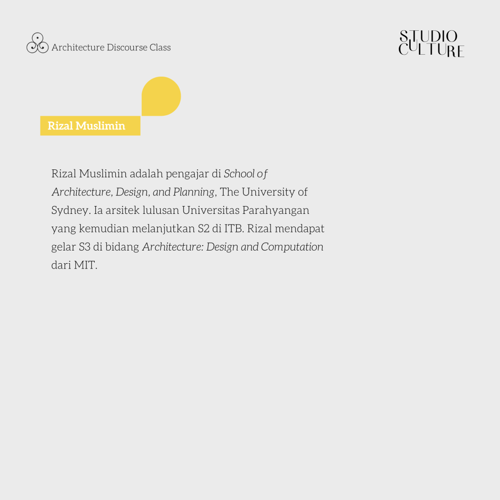 Hi Sahabat! Sesi keempat Studio Culture kita akan bertema Komputasi, diisi oleh Rizal Muslimin, seorang pengajar di School of Architecture, Design, and Planning, The University of Sydney. Ia arsitek lulusan Universitas Parahyangan yang kemudian melanjutkan S2 di ITB. Rizal mendapat gelar S3 di bidang Architecture: Design and Computation dari MIT.