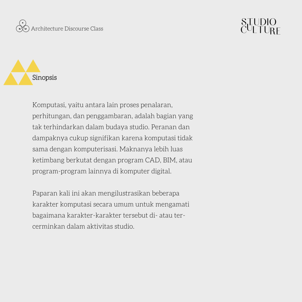 Komputasi, yaitu antara lain proses penalaran, perhitungan, dan penggambaran, adalah bagian yang tak terhindarkan dalam budaya studio. Peranan dan dampaknya cukup signifikan karena komputasi tidak sama dengan komputerisasi. Maknanya lebih luas ketimbang berkutat dengan program CAD, BIM, atau program-program lainnya di komputer digital..