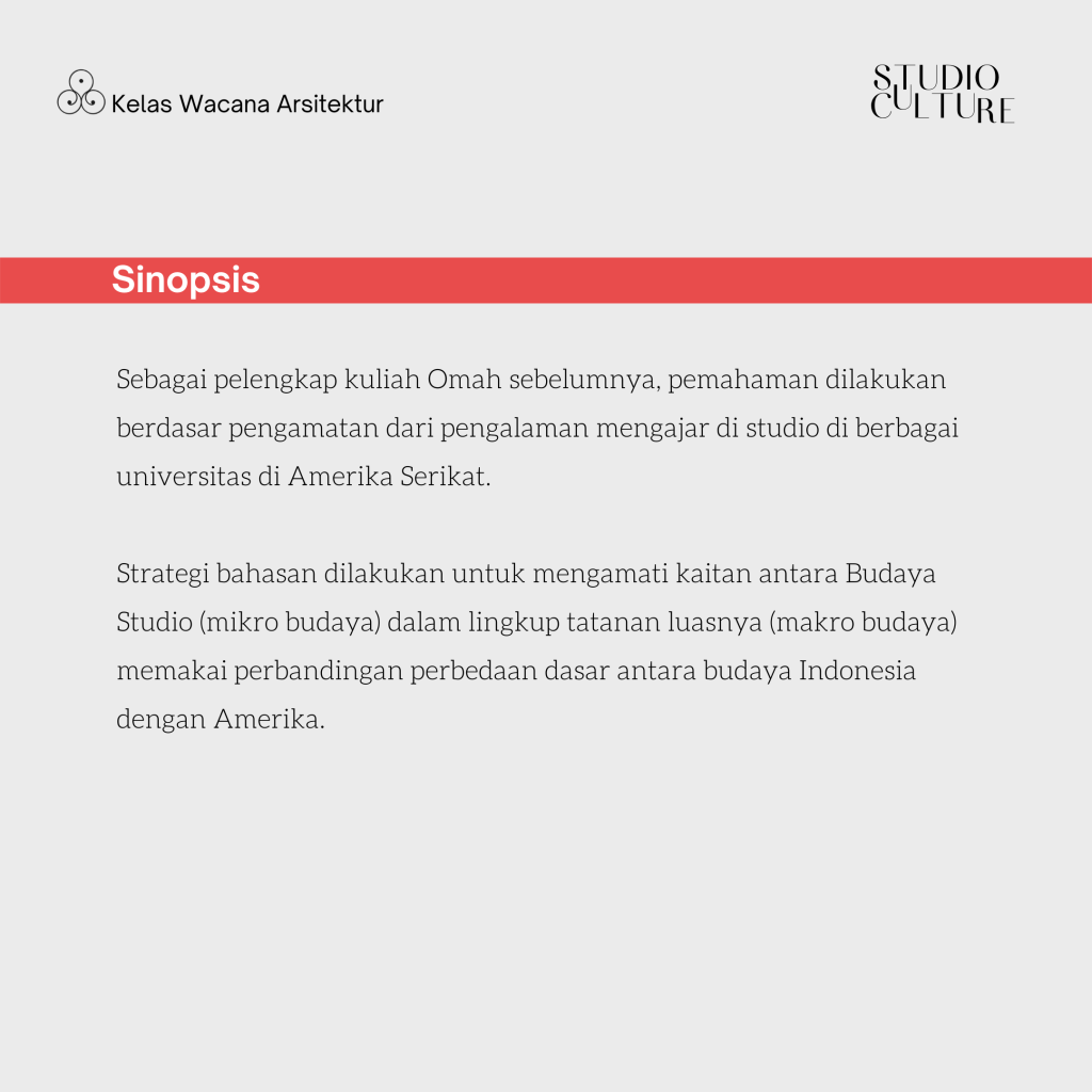 Setiap praktisi arsitektur memiliki pendekatan desain yang sangat beragam. Proses yang linear dan kerap kali berputar-putar membentuk sebuah relasi yang tumpang tindih antara filosofi sampai metode, aktor-aktor seperti arsitek, tim arsitek, klien dan desainer, maupun antara dosen dan mahasiswa di dalam pembelajaran simulasi desain. Hal ini menciptakan sebuah benang merah dari budaya berpikir dan berbuat yang khas di dalam studio, yang biasa kita jumpai dalam sekolah arsitektur maupun dunia praktik arsitek. Pada dasarnya, praktik mendesain arsitektur adalah sebuah proses aksi–reaksi dimana untuk memahaminya, kita perlu mengalaminya, namun ada saatnya pula kita merefleksikan apa yang telah kita alami, mengevaluasikan dan membagikan pengalaman tersebut dengan orang lain. Hal ini menjadi titik berangkat diskusi Studio Culture yang membahas ketujuh sisi pendekatan dari para narasumber: