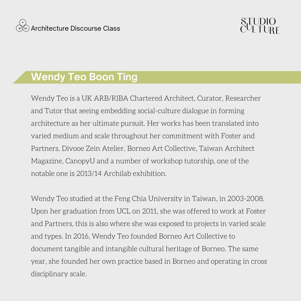 Hi everyone! Continuing the preceding lectures on Studio Culture, the sixth lecture will be delivered by Wendy Teo. She is a UK ARB/RIBA Chartered Architect, Curator, Researcher and Tutor that seeing embedding social-culture dialogue in forming architecture as her ultimate pursuit. Her works has been translated into varied medium and scale throughout her commitment with Foster and Partners, Divooe Zein Atelier, Borneo Art Collective, Taiwan Architect Magazine, CanopyU and a number of workshop tutorship, one of the notable one is 2013/14 Archilab exhibition.