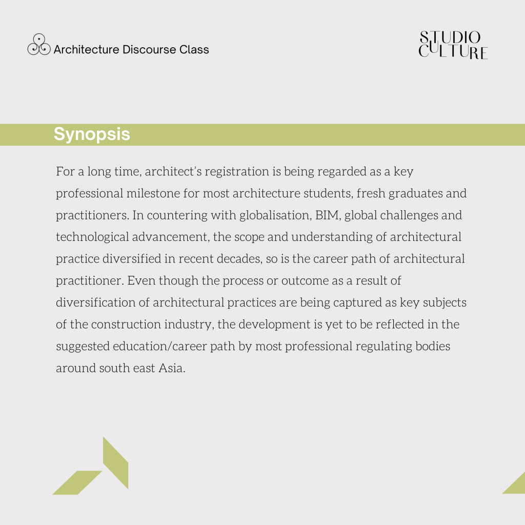 For a long time, architect’s registration is being regarded as a key professional milestone for most architecture students, fresh graduates and practitioners. In countering with globalization, BIM, global challenges and technological advancement, the scope and understanding of architectural practice diversified in recent decades, so is the career path of architectural practitioner. Even though the process or outcome as a result of diversification of architectural practices are being captured as key subjects of the construction industry, the development is yet to be reflected in the suggested education/career path by most professional regulating bodies around south east Asia.