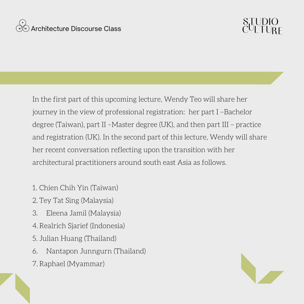 In the first part of this upcoming lecture, Wendy Teo will share her journey in the view of professional registration: her part I –Bachelor degree (Taiwan), part II –Master degree (UK), and then part III – practice and registration (UK). In the second part of this lecture, Wendy will share her recent conversation reflecting upon the transition with her architectural practitioners around south east Asia as follows.