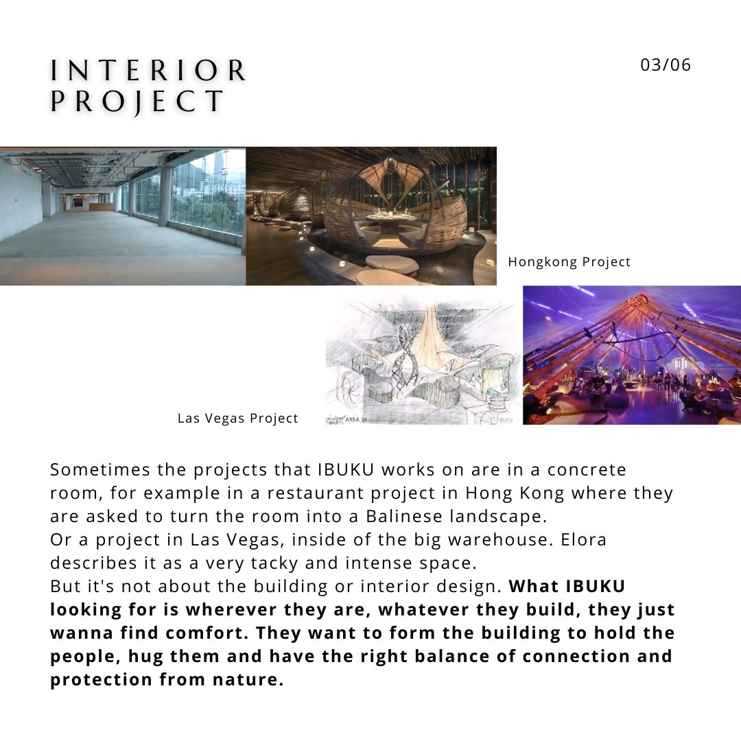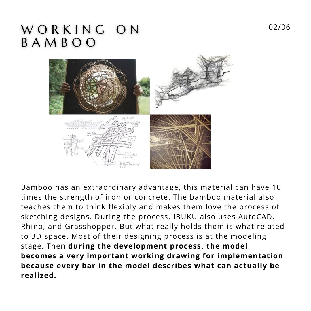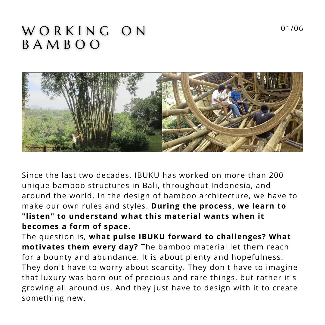 Written by: Nirma Ayuni Setiasih IBUKU is a team of young designers, architects, and engineers exploring groundbreaking ways of using bamboo to build homes, hotels, schools, and event spaces in Bali, Indonesia. Since the last two decades, IBUKU has worked on more than 200 unique bamboo structures in Bali, throughout Indonesia, and around the world. IBUKU’s Goal is to provide spaces in which people can live in an authentic relationship with nature. What IBUKU looking for is wherever they are, whatever they build, they just wanna find comfort. They want to form the building to hold the people, hug them…