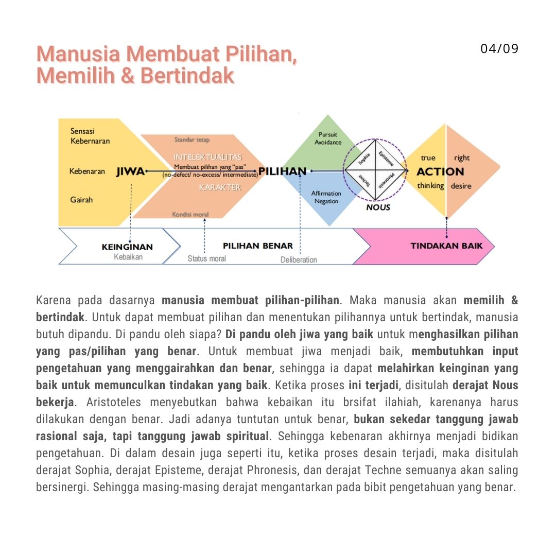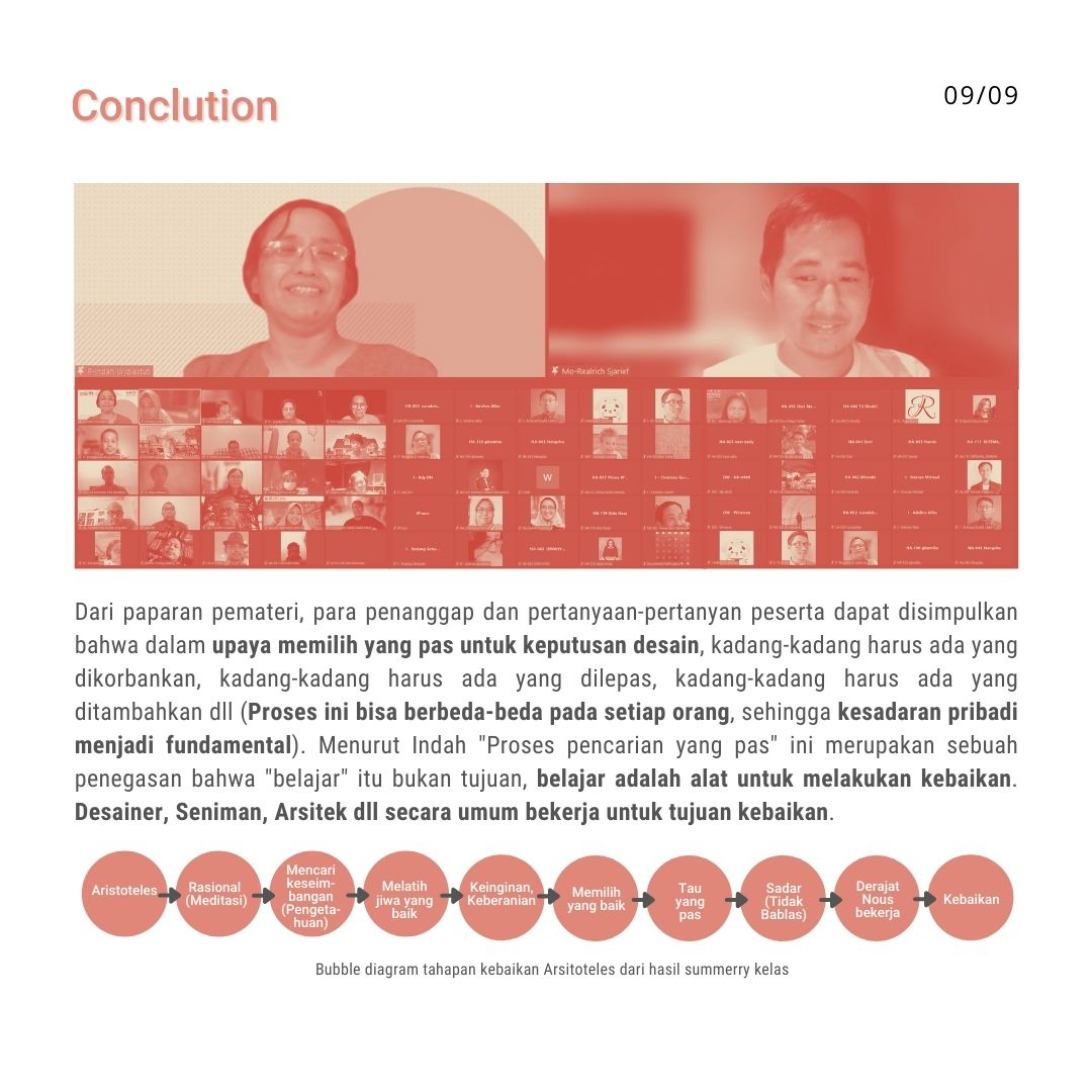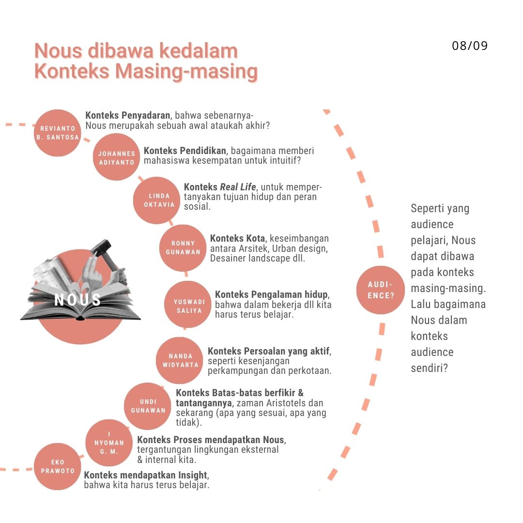 Dari paparan beliau, konteks-konteks dari para penanggap membuka wawasan audience untuk dapat juga membawa Nous kedalam konteks diri mereka masing-masing. Dalam upaya memilih yang pas untuk keputusan desain, kadang-kadang harus ada yang dikorbankan, kadang-kadang harus ada yang dilepas, kadang-kadang harus ada yang ditambahkan dll (Proses ini bisa berbeda-beda pada setiap orang, sehingga kesadaran pribadi menjadi fundamental). Menurut baliau “Proses pencarian yang pas” ini merupakan sebuah penegasan bahwa “belajar” itu bukan tujuan, belajar adalah alat untuk melakukan kebaikan. Desainer, seniman, arsitek dll secara umum mereka bekerja untuk tujuan kebaikan.