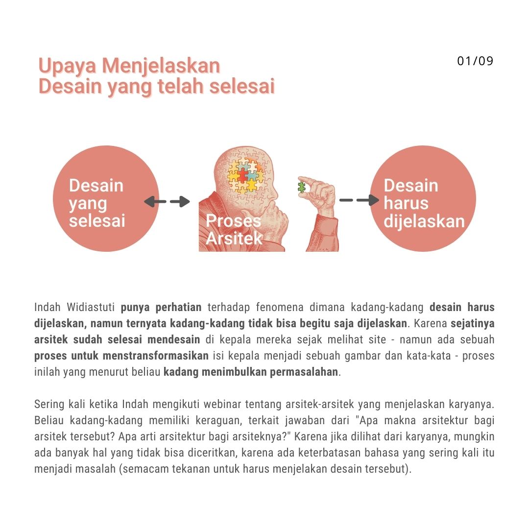 Indah Widiastuti mempunyai perhatian terkait adanya upaya untuk menjelaskan desain yang telah selesai, yang terkadang menimbulkan sebuah permasalahan yang di sebabkan oleh ketidakmampuan desainer dalam mengkomunikasikan desain mereka dengan baik.