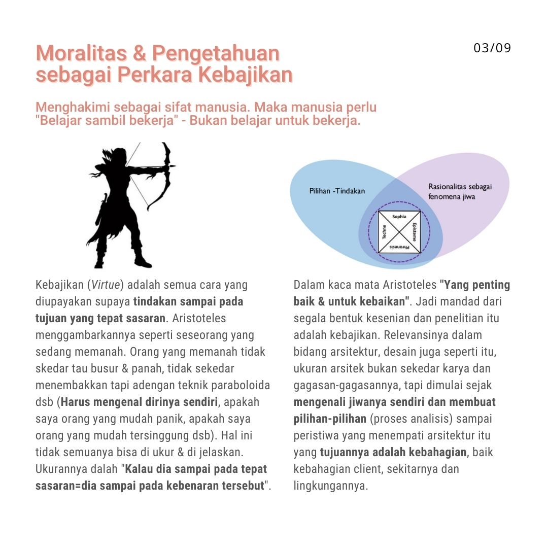 Dalam kaca mata Aristoteles “Yang penting prosesnya baik & tujuannya untuk kebaikan”. Jadi mandad dari segala bentuk kesenian dan penelitian itu adalah kebajikan.
