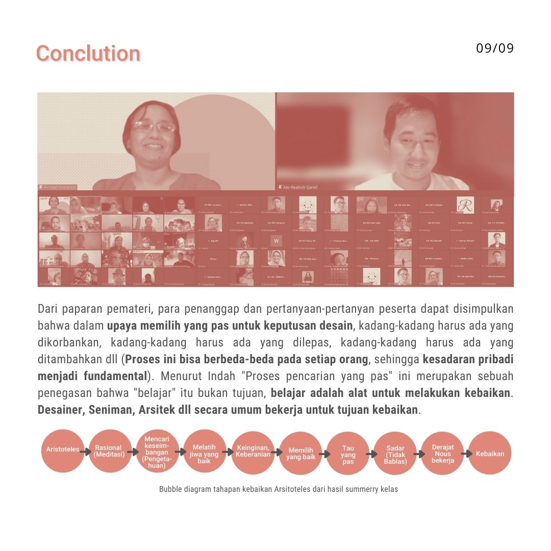 Rangkuman oleh Lu’luil Ma’nun Dirangkum dari Kuliah tanggal 03.11.2021, diisi oleh Indah Widiastuti, moderator: Realrich Sjarief, host: Lu’luil Ma’nun Adanya upaya untuk menjelaskan desain yang telah selesai terkadang menimbulkan sebuah permasalahan. Disebabkan oleh ketidakmampuan desainer dalam mengkomunikasikan desain mereka dengan baik. Oleh karena itu desainer sebagai manusia perlu belajar untuk mengasah diri agar proses analisis desainnya menghasilkan keputusan-keputusan yang baik dan benar. Dengan kata lain mengawali proses desain dengan niatan untuk kebaikan. Indah Widiastuti punya perhatian…