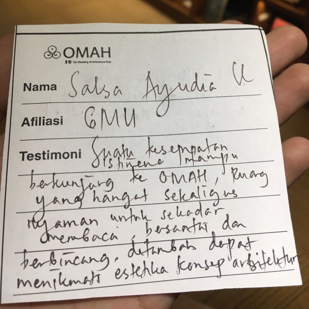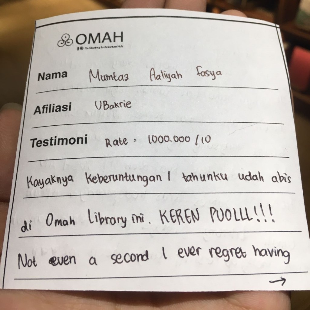 Suatu kesempatan istimewa mampu berkunjung ke Omah, ruang yang hangat sekaligus nyaman untuk sekedar membaca, bersantai dan berbincang, ditambah dapat menikmati estetika konsep arsitektur yang astoinishing. Tetap menyala untuk Omah dan seluruh yang bekerja didalamnya!!
