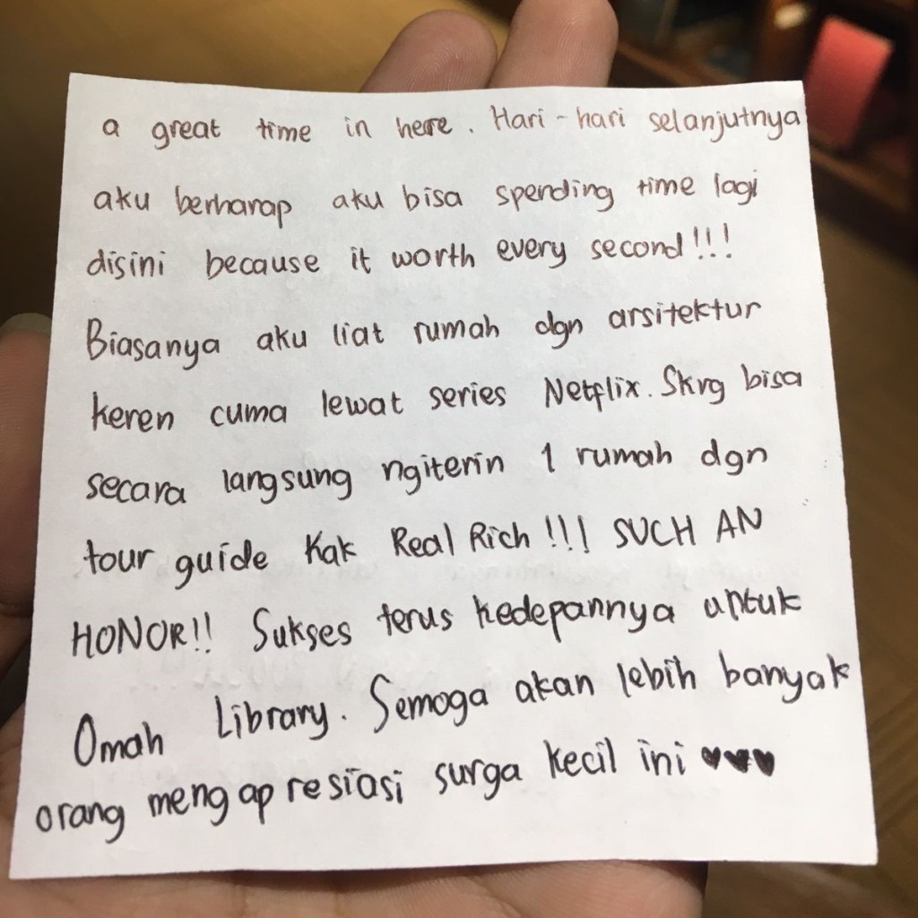 Rate: 1.000.000/10. Kayaknya keberuntungan 1 tahunku udah habis di Omah library ini. Keren puolll!!!! Not even a second I ever regret having a great time in here. Hari-hari selanjutnya aku berharap aku bisa spending time lagi disini because it worth every second!!! Biasanya aku liat rumah dengan arsitektur keren cuma lewat series netflix. Sekarang bisa secara langsung ngiterin 1 rumah dengan tour guide kak Realrich!!! Such an honor!! Sukses terus kedepannya untuk Omah Library. Semoga akan lebih banyak orang mengapresiasi surga kecil ini ❤