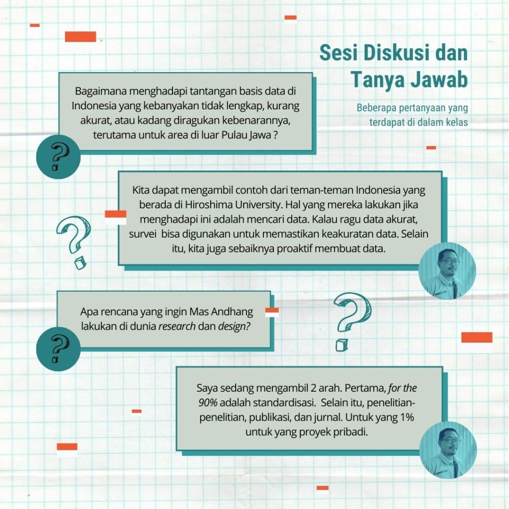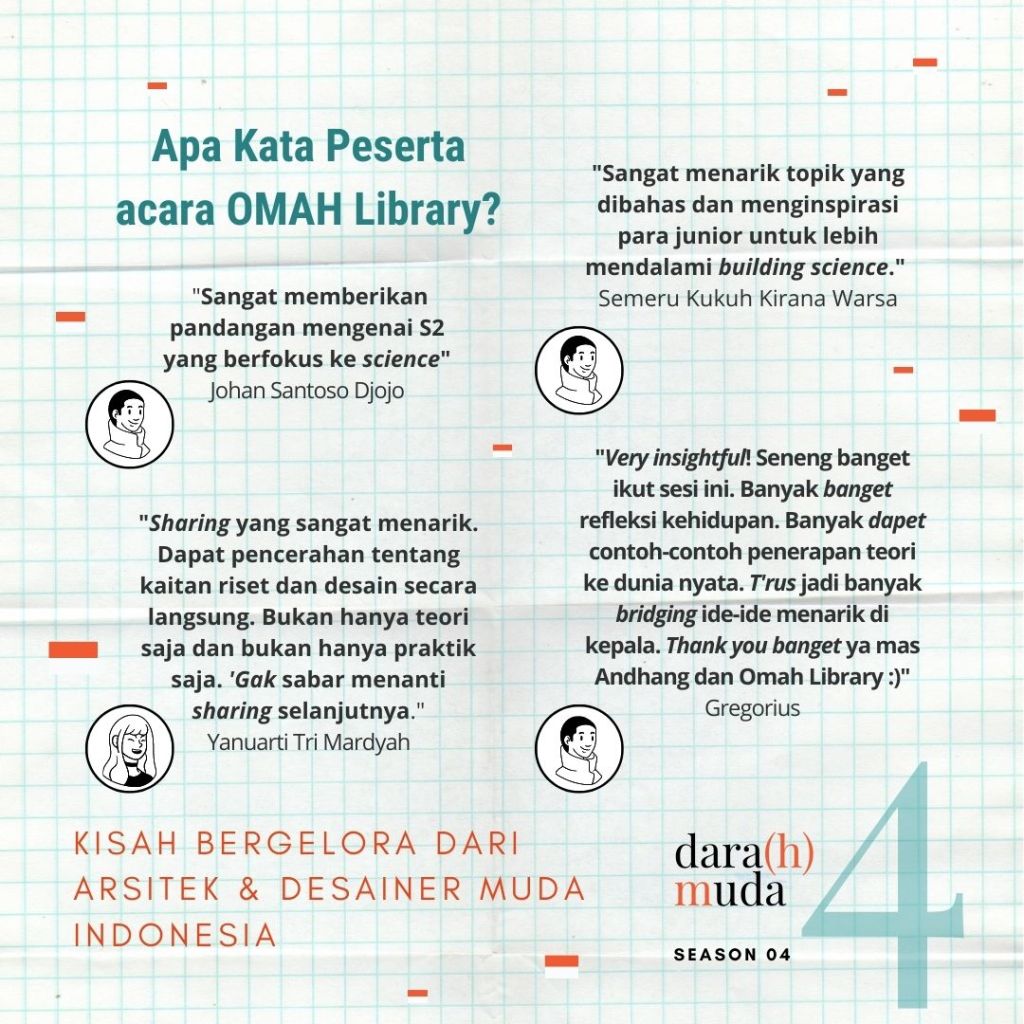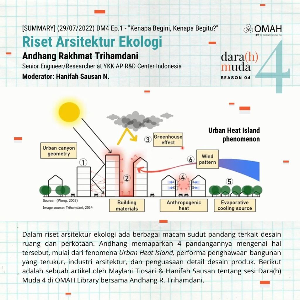Andhang memaparkan 4 pandangannya mengenai kenyamanan termal dari segi desain dan ruang kota, mulai dari fenomena Urban Heat Island, performa penghawaan bangunan yang terukur, industri arsitektur, dan penguasaan detail desain produk. Berikut adalah sebuah artikel oleh Maylani Tiosari @meinnamelani & Hanifah Sausan tentang sesi Dara(h) Muda 4 di OMAH Library bersama Andhang R. Trihamdani.