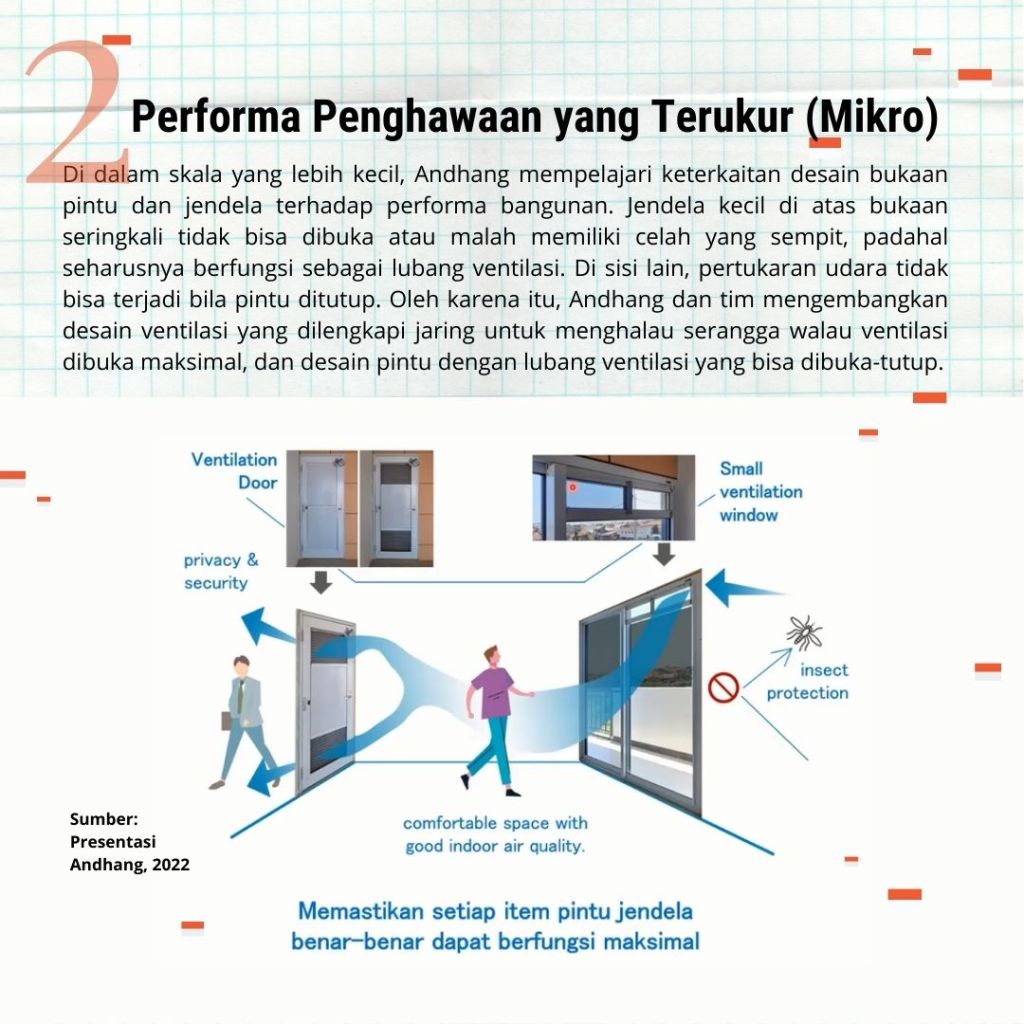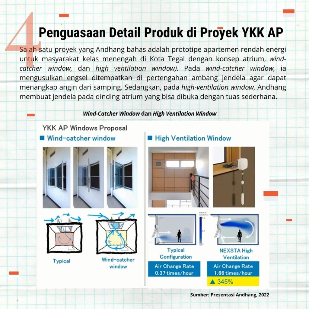 Pertanyaan yang dimiliki Andhang sejak S1 tentang prinsip-prinsip aliran udara dalam penghawaan mengantarkannya pada perjalanan arsitektur yang unik. Mulai dengan bekerja di firma (DOT Workshop-RAW Architecture) seperti lulusan arsitektur pada umumnya, Andhang kemudian meneruskan perjalanannya dengan berkuliah S2 dan S3 di jalur riset. Ia sekarang merupakan Senior Engineer/Researcher di lembaga riset dan pengembangan produk YKK AP yang menunjukkan bahwa banyak riset-riset praktikal yang Andhang lakukan terkait kenyamanan termal.