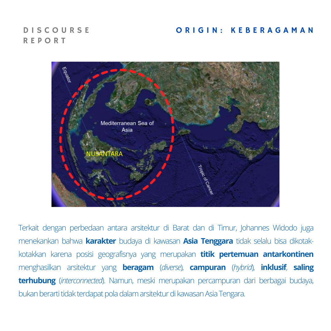 The questions of Origin is related to Identity, and it is about our mindset and ideological construct. Architecture is the physical manifestation of human culture, the product of human ideological construct and mindset. The physical articulation of architecture and the city is the reflection of the “spirit of the ages” (“Zeitgeist”) or the social-political-cultural aspects of the people, evolving along the historical timeline. Being at the cross-road of civilizations, Southeast Asia has been very open towards various influences from various cultures.