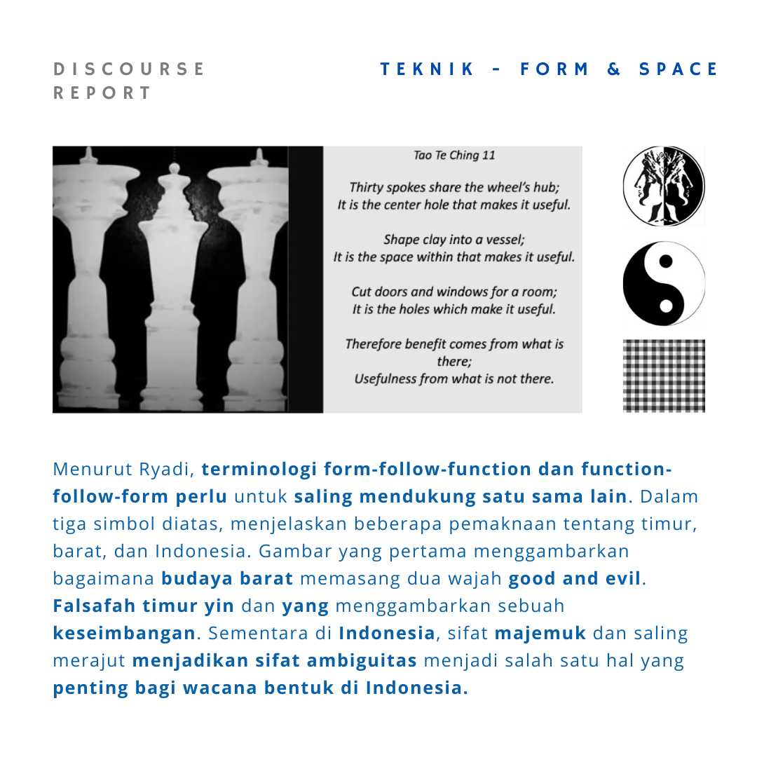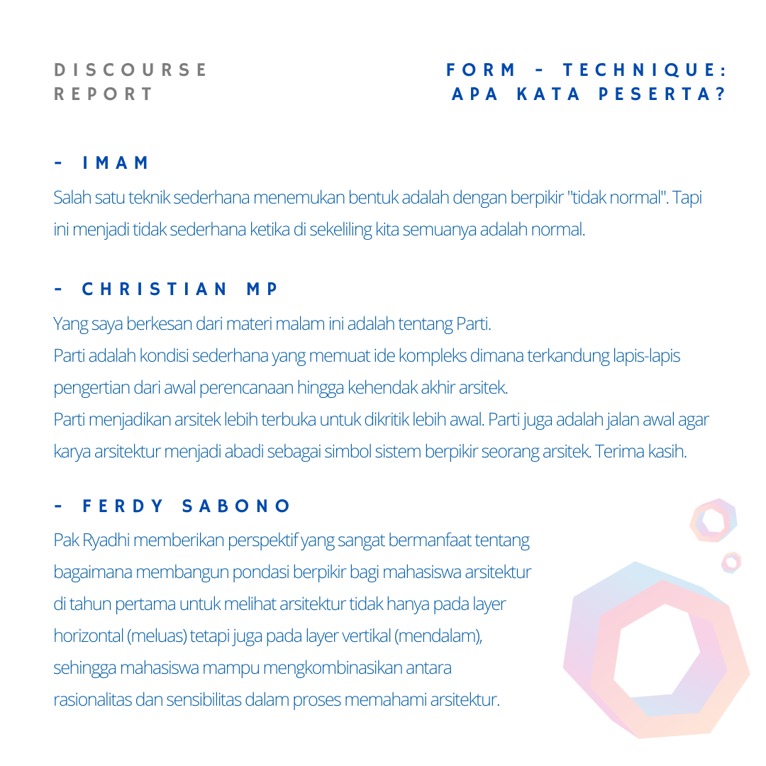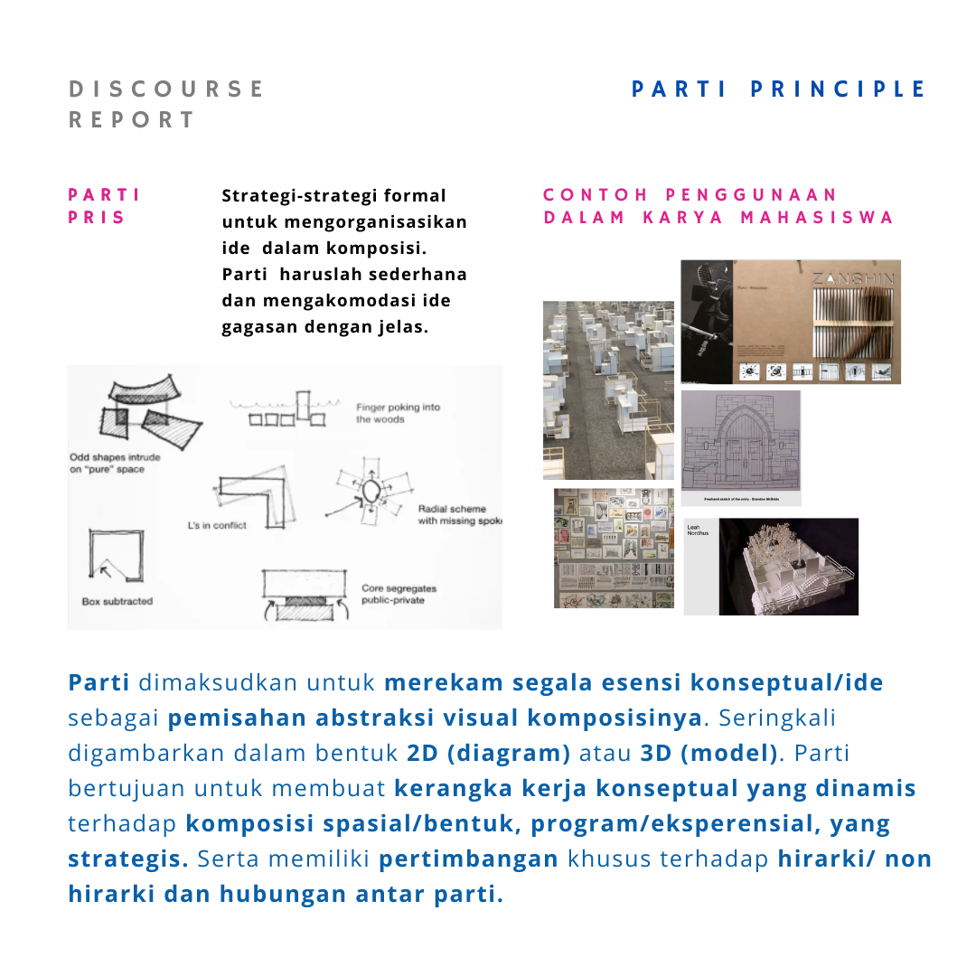 Ryadi Adityavarman memberikan gambaran bahwa pembahasan akan dilakukan secara singkat namun padat dengan mengkaji karya gubah bentuk-ruang untuk mahasiswa dalam studio tingkat awal. Dan titik utama bahasan mengenai metode parti sebagai warisan lanjut dari tradisi Ecole de’ Beaux Arts dan Bauhaus.