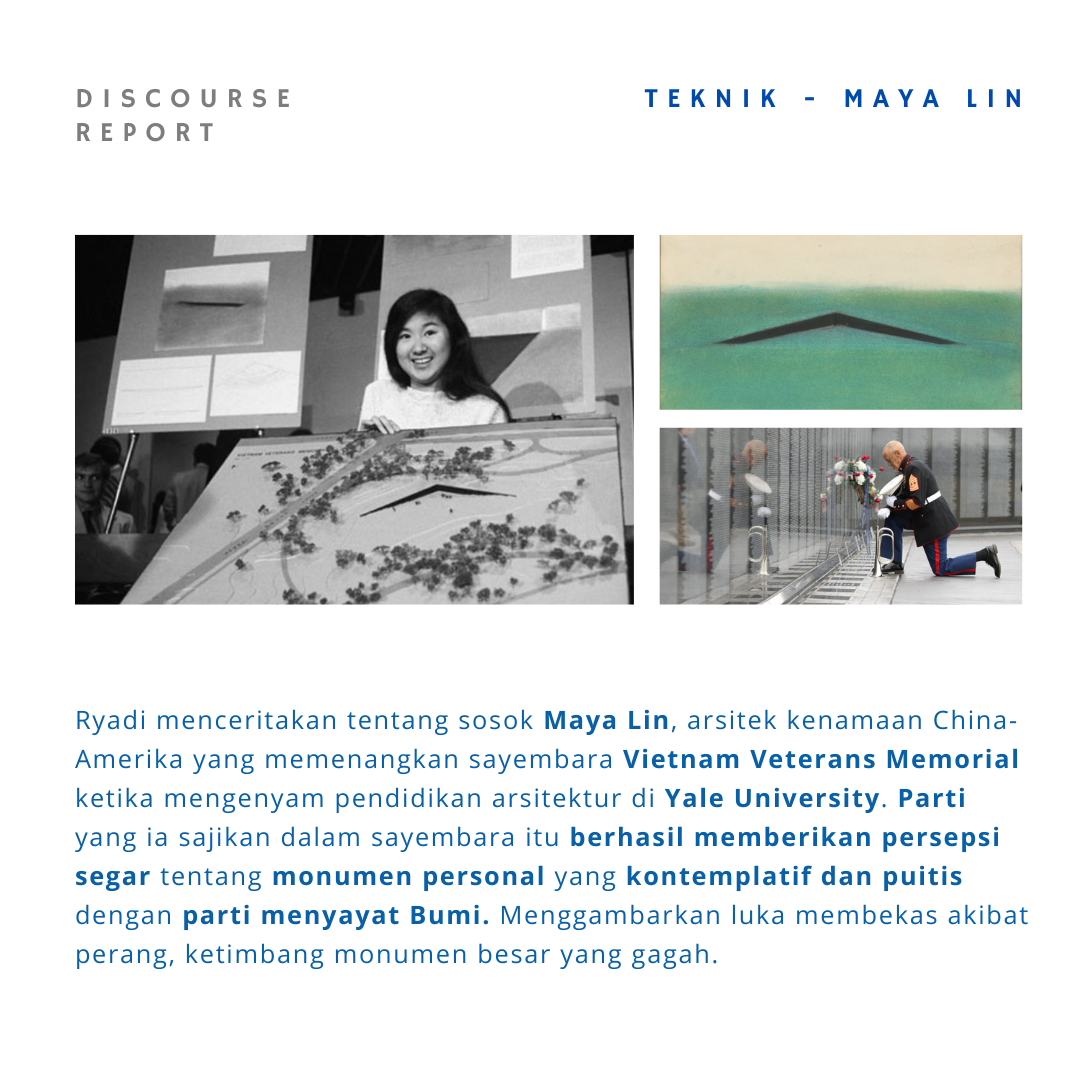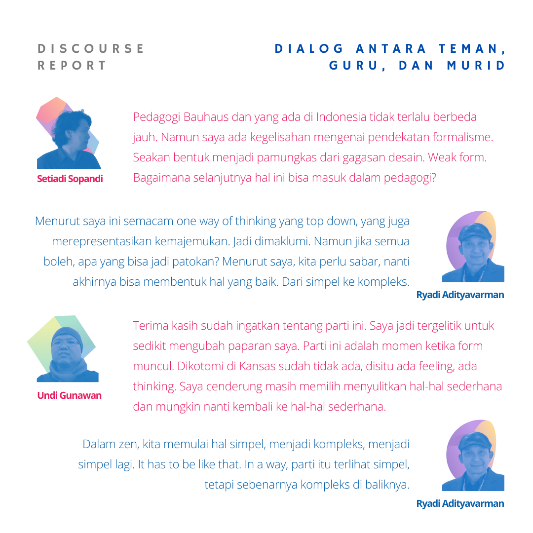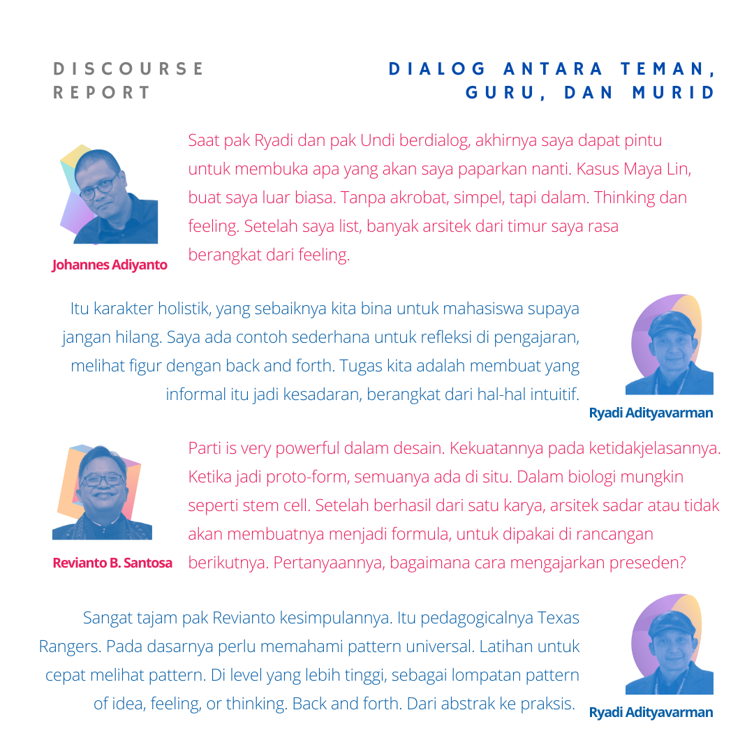 Pak Ryadhi memberikan perspektif yang sangat bermanfaat tentang bagaimana membangun pondasi berpikir bagi mahasiswa arsitektur di tahun pertama untuk melihat arsitektur tidak hanya pada layer horizontal (meluas) tetapi juga pada layer vertikal (mendalam), sehingga mahasiswa mampu mengkombinasikan antara rasionalitas dan sensibilitas dalam proses memahami arsitektur.