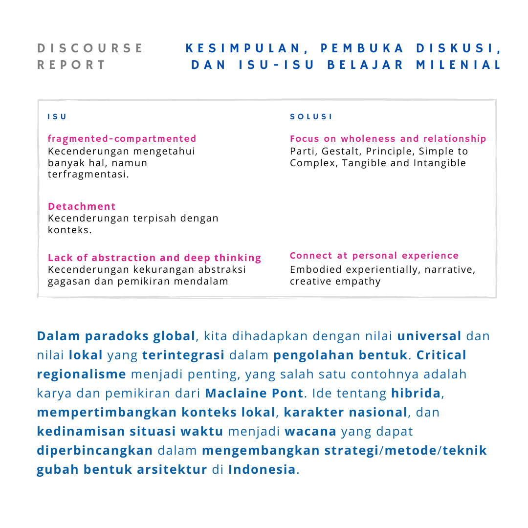 Tujuan sederhana dari presentasi adalah berguna untuk memicu apresiasi dan membuka diskusi mengenai peran dan tantangan gubah bentuk-ruang yang kemudian dapat diterapkan secara tepat dalam konteks khusus pendidikan dan praktek di tanah air.