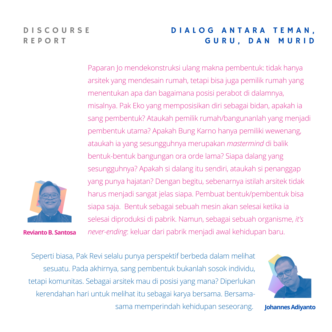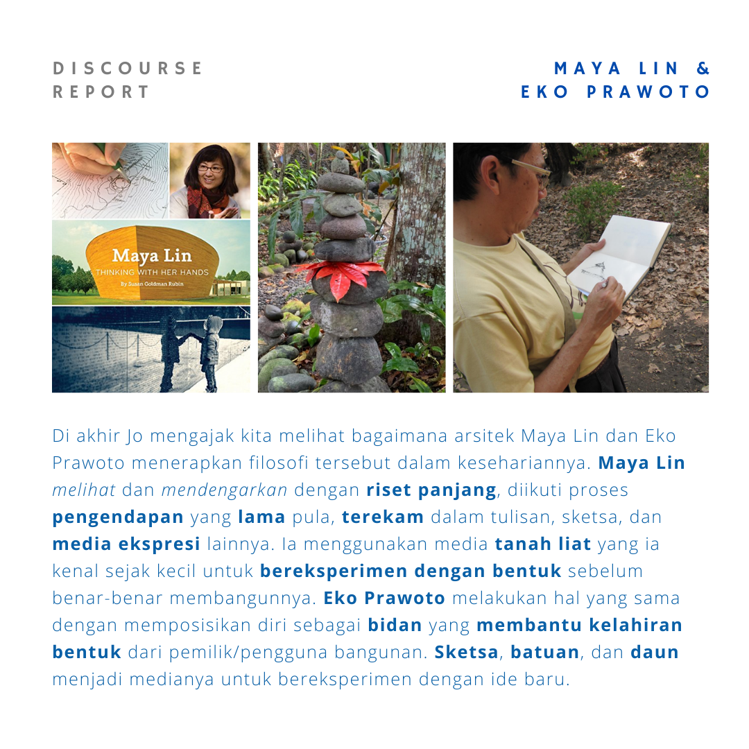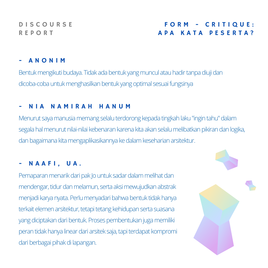 Pemaparan menarik dari pak Jo untuk sadar dalam melihat dan mendengar, tidur dan melamun, serta aksi mewujudkan abstrak menjadi karya nyata. Perlu menyadari bahwa bentuk tidak hanya terkait elemen arsitektur, tetapi tetang kehidupan serta suasana yang diciptakan dari bentuk. Proses pembentukan juga memiliki peran tidak hanya linear dari arsitek saja, tapi terdapat kompromi dari berbagai pihak di lapangan.