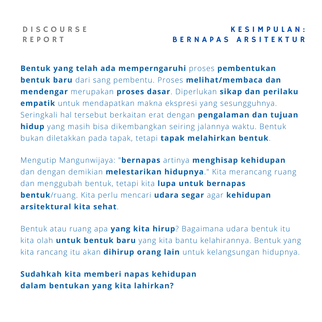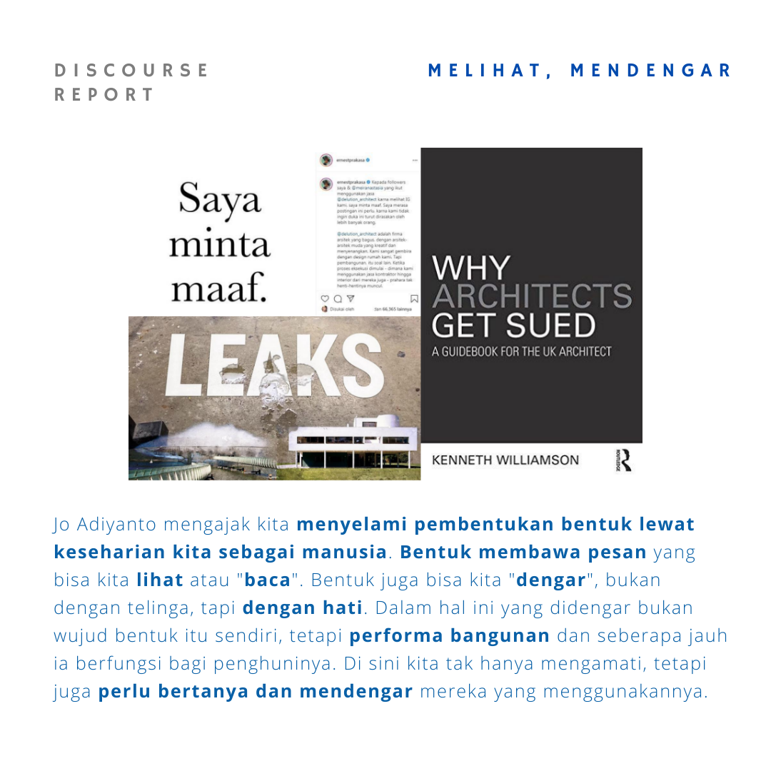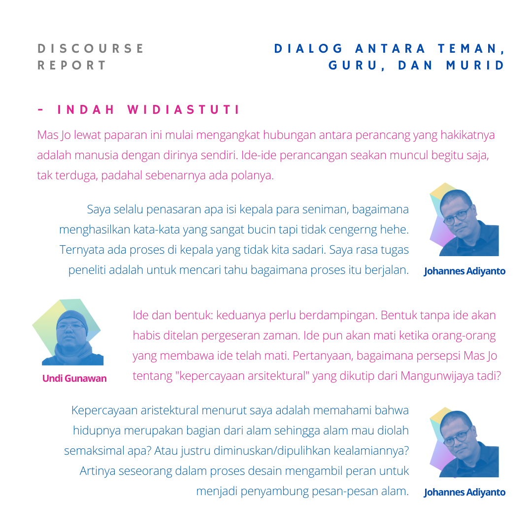 Pemaparan menarik dari pak Jo untuk sadar dalam melihat dan mendengar, tidur dan melamun, serta aksi mewujudkan abstrak menjadi karya nyata. Perlu menyadari bahwa bentuk tidak hanya terkait elemen arsitektur, tetapi tetang kehidupan serta suasana yang diciptakan dari bentuk. Proses pembentukan juga memiliki peran tidak hanya linear dari arsitek saja, tapi terdapat kompromi dari berbagai pihak di lapangan.