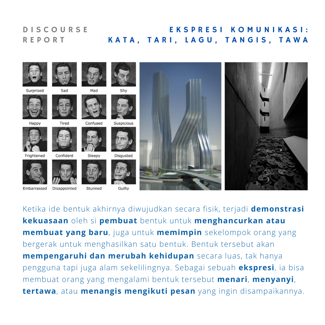 Bentuk yang berwujud itu adalah “perkataan” arsitek. Bentuk adalah cara berkomunikasi arsitek yang mungkin saja setara dengan nyanyian seorang penyanyi, atau tarian seorang seniman tari yang bisa membuat penikmatnya tertawa dan menangis sebab sang penikmat melihat, mendengar, dan “menghuni” di dalam “kata-kata” arsitek. Hal yang menjadi penting bagi kelangsungan hidup arsitek justru pada apresiasi pengamat, di situlah oksigen bagi nafas kehidupan arsitek.