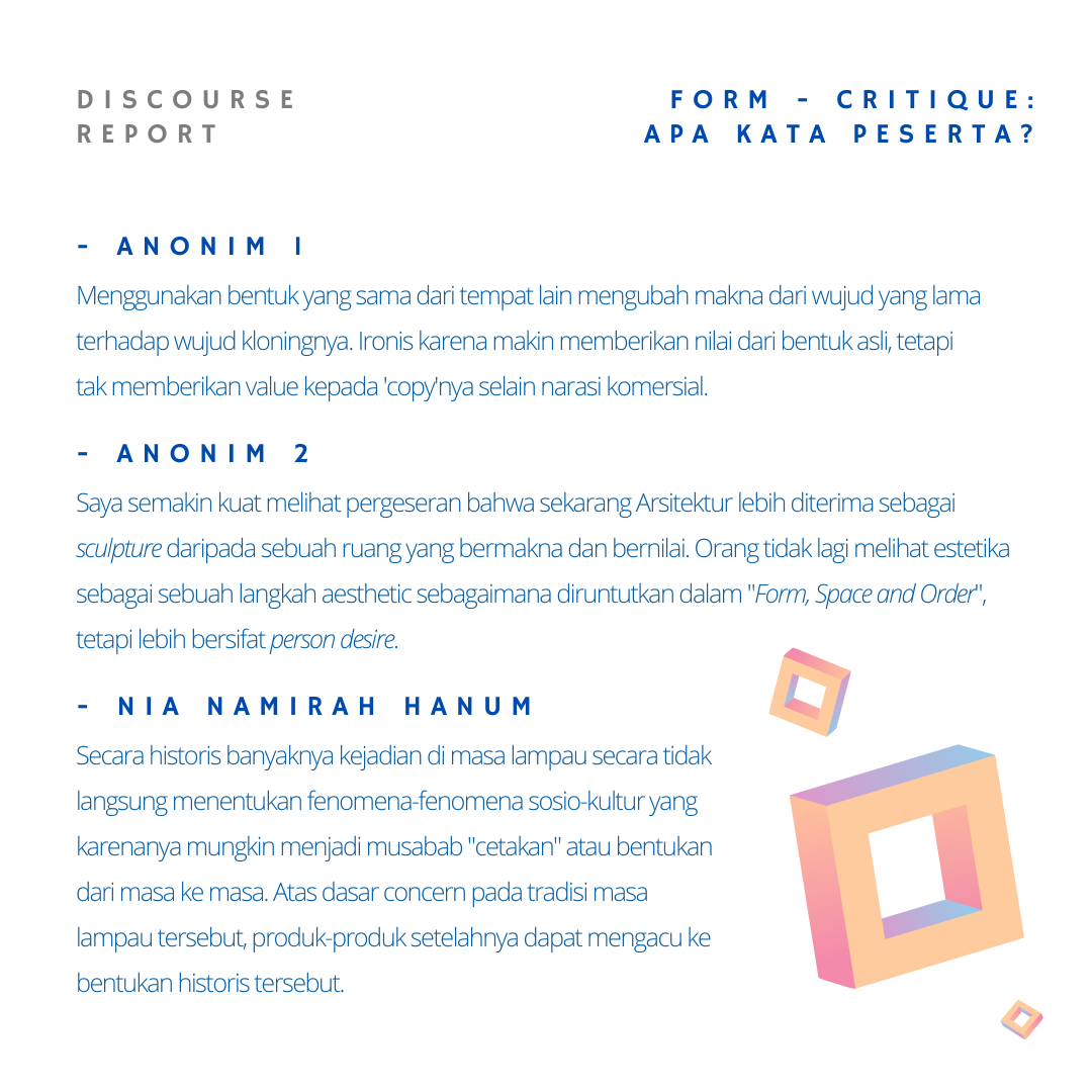 A: Form dalam Arsitektur itu memiliki spektrum yang sangat luas. Di satu sisi Form paling mudah dikenali dan diidentifikasikan. Di sisi lain Form menyandang kompleksitas yang luar biasa karena sifatnya yang multi-relasi, multi-representasi dan multi-interpretasi.
