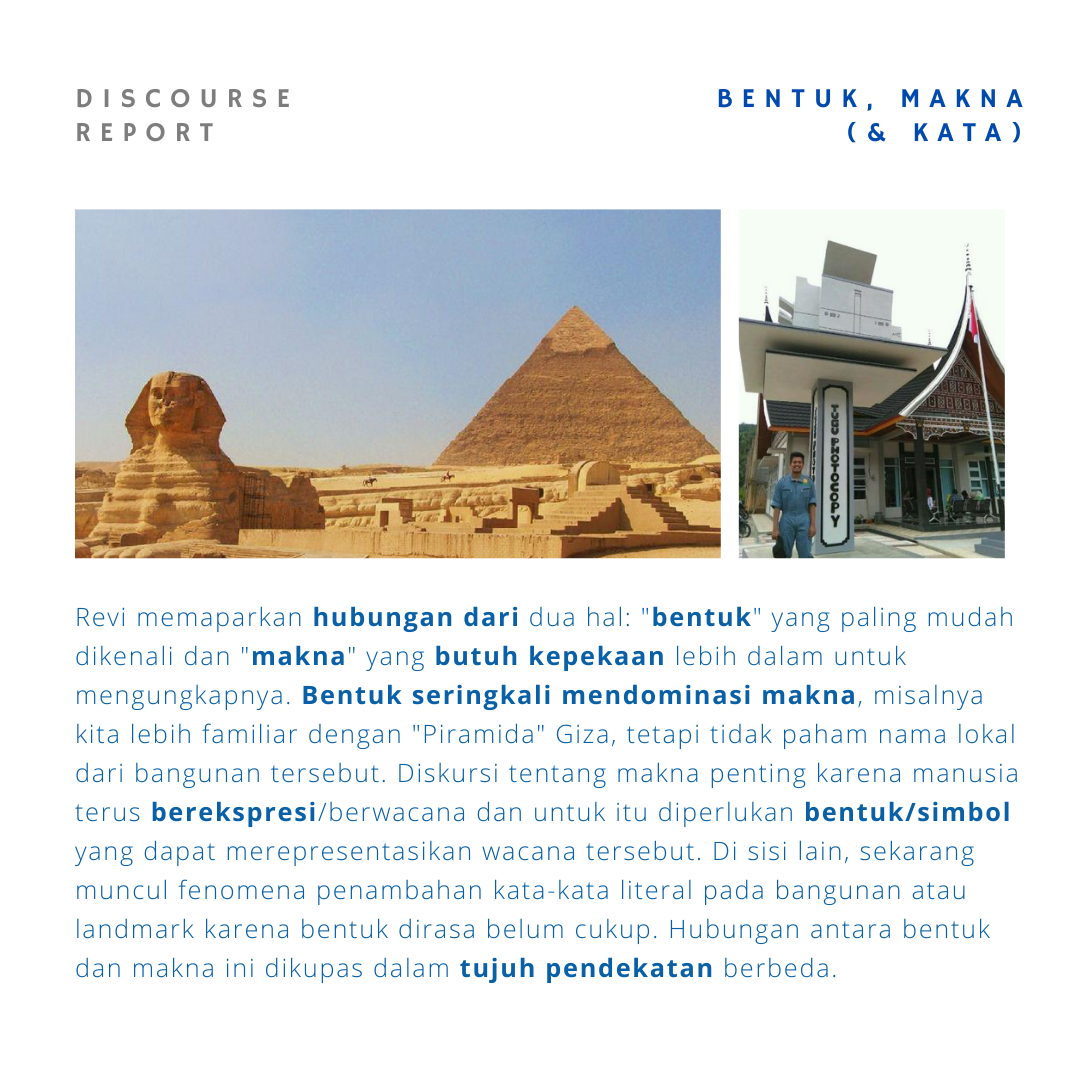 Bentuk adalah hal yang paling mudah untuk dikenali dari Arsitektur. Dengan segera begitu kita berada di depan suatu bangunan kita mencerap (perceive) bentuk. Di sisi lain, makna adalah hal yang paling mendalam sehingga memerlukan aktivitas mental dengan intensitas yang tinggi untuk dapat mengungkap makna suatu bentuk. Presentasi ini berupaya untuk menyajikan beberapa pendekatan yang dapat dilakukan untuk menghubungkan antara bentuk dan makna sehingga dapat memperkaya wawasan tentang kompleksitas hubungan antara keduanya.