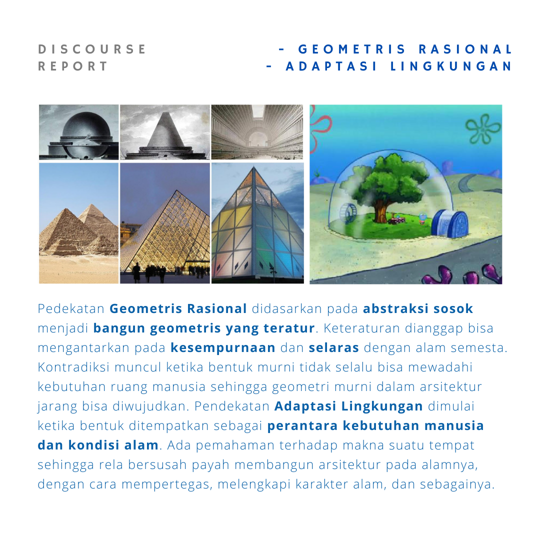 Pedekatan GEOMETRIS RASIONAL. Pendekatan ini didasarkan pada kemampuan abstraksi suatu sosok menjadi bangun geometris tertentu yang dapat dipahami sebagai suatu keteraturan rasional. Keteraturan ini memiliki beragam dimensi, seperti abstraksi ideal (Plato), estetis-antropomorfis (Corbusier) dan universal harmony (Alberti)