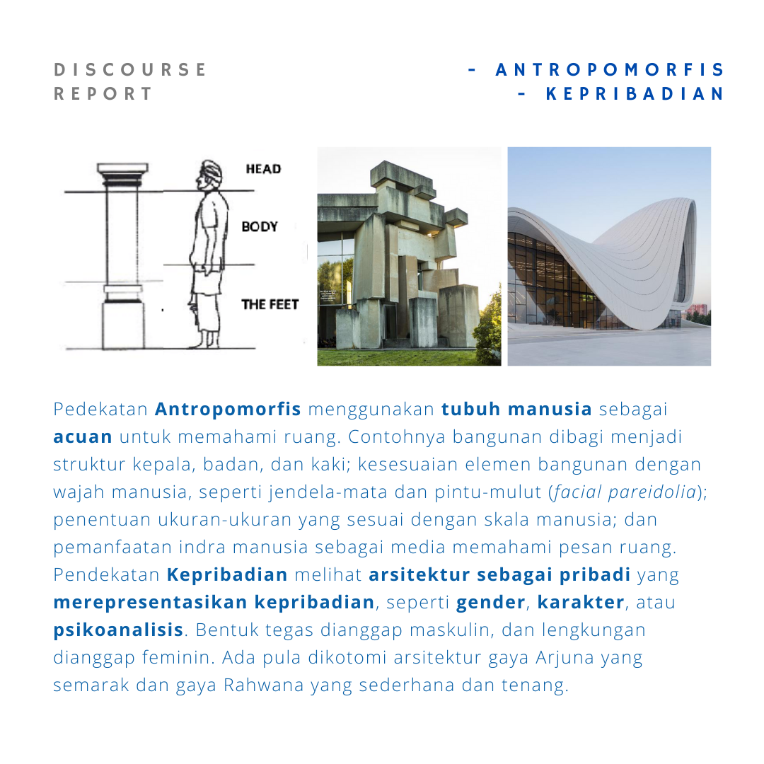 Pendekatan ANTROPOMORFIS. Pendekatan ini didasarkan pada ketubuhan diri manusia yang mendudukkan tubuh sebagai skema untuk memahami semesta, di antaranya memahami bentuk arsitektur. Pendekatan ini memiliki beragam relasi. Facial pareidolia, misalnya, yang memahami wajah sebagai hal yang utama yang tercermin dalam segala sesuatu. Pembagian kepala-badan-kaki dan pemahaman arsitektur yang phallocentric juga merupakan salah satu relasi penting.