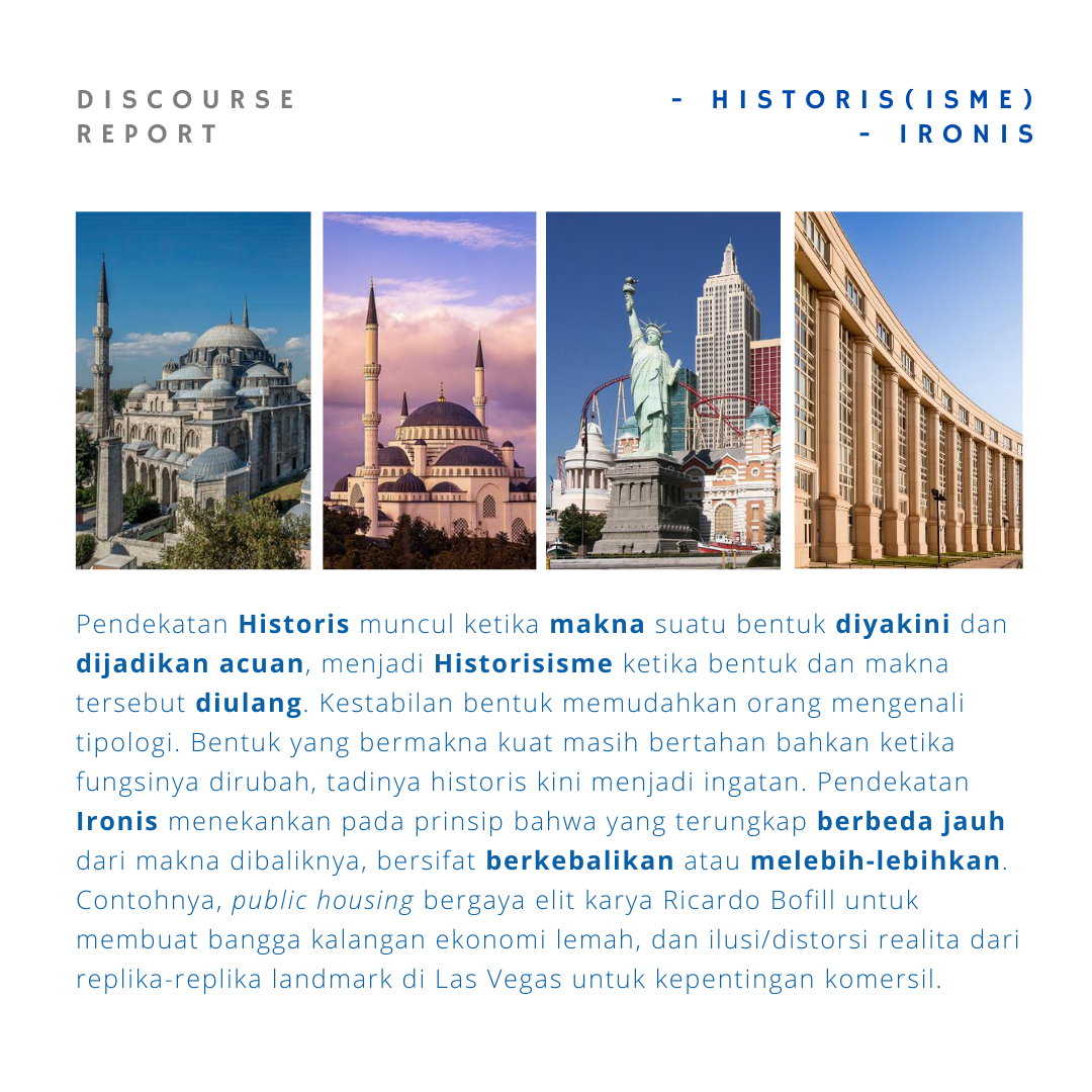Pendekatan HISTORIS[ISME]. Pendekatan ini didasarkan pada rujukan pada suatu [atau sekumpulan] objek historis yang dipandang memiliki kestabilan makna. Dengan kestabilan tersebut suatu objek menjadi rumusan bentuk dengan makna yang diyakini kemapanannya sehingga menjadi tipe yang dapat diacu senantiasa, sebagaimana argumen Leon Krier. Sisi kritis dari rujukan kesejarahan ini diajukan oleh Rossi dengan konsepnya tentang “ingatan bersama”.