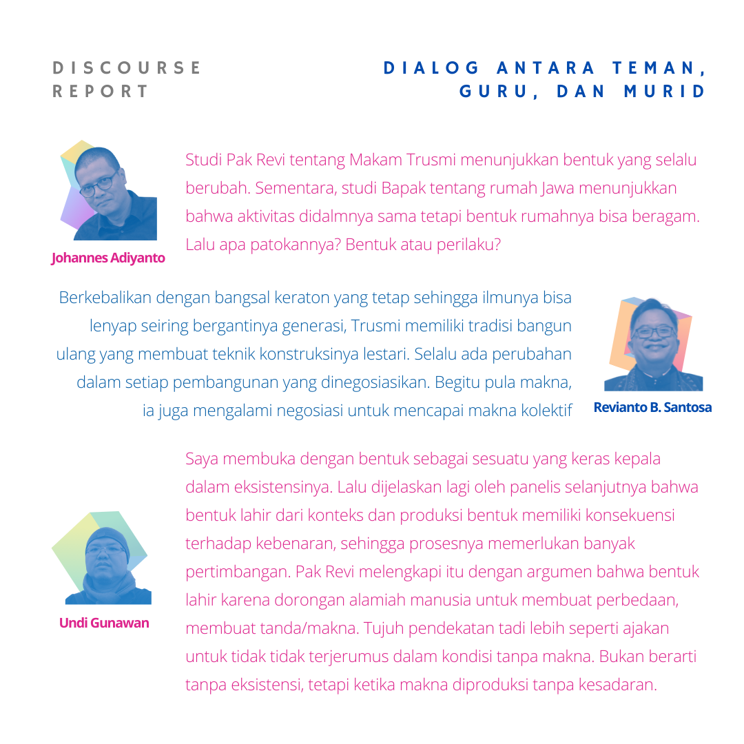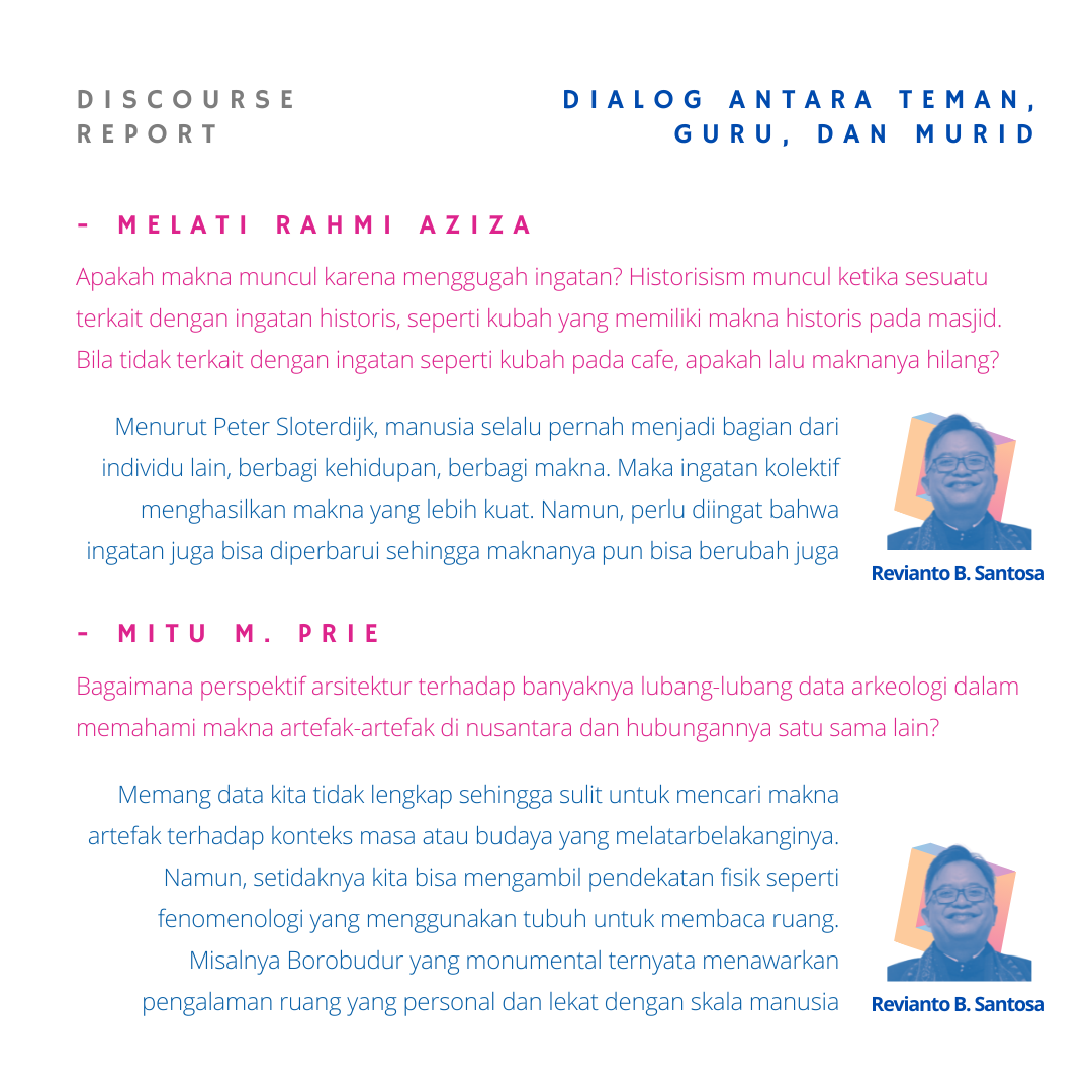 Tentang form & meaning historis(isme). Ketika melihat slides contoh-contoh masjid Istanbul 1548 sampai masjid Pasar Minggu 2022 bagaimana masjid-masjid tersebut memiliki ‘ciri’ yg sama. Pemahaman yg dapat saya ambil bahwa, Secara historis banyaknya kejadian di masa lampau secara tidak langsung menentukan fenomena-fenomena sosio-kultur, yang karenanya mungkin menjadi musabab ‘cetakan’ atau bentukan dari masa ke masa. Atas dasar concern pada tradisi masa lampau tsb, produk-produk setelahnya dapat mengacu ke bentukan historis tersebut. Ini yang saya pahami dari tulisan Pak Revi tentang kestabilan makna yg dapat senantiasa diacu. Events of history, to relativizing of cultures. Terima kasih Omah dan Pak Revi khususnya, serta para penanggap atas paparan yg seru malam ini. Thumbs up