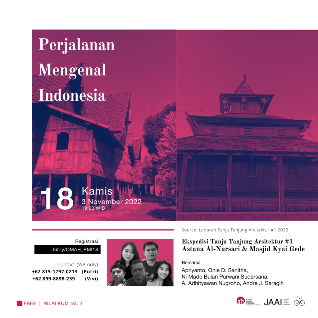 Ikuti pembahasan lengkap tentang tektonika kayu arsitektur Astana Alnursari & Masjid Kyai Gede di sesi PMI pada hari Kamis, 3 November 2022 | 19.00 WIB. Kegiatan yang bekerjasama dengan IAI Kalimantan Tengah ini memiliki nilai KUM IAI: 2.