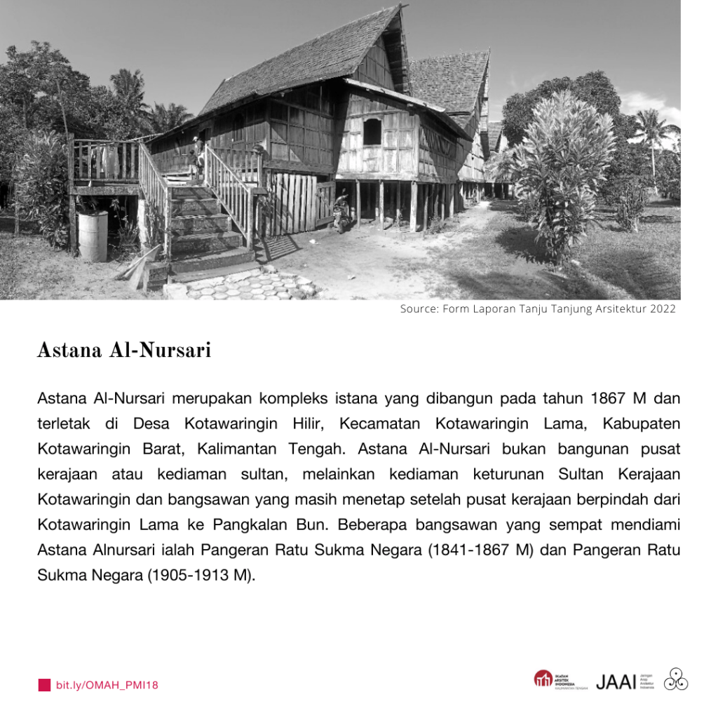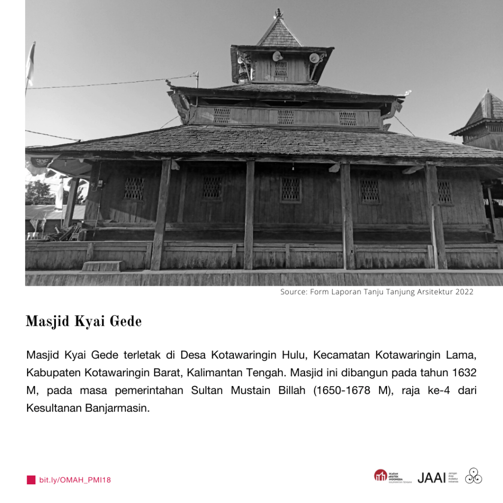 Setelah kemarin sukses mengadakan PMI #17, pekan depan IAI Kalimantan Tengah bersama dengan JAAI dan Omah Library akan kembali hadir dengan PMI-18 yang akan membicarakan membicarakan tektonika kayu arsitektur Astana Al Nursari & Masjid Kyai Gede. Dua situs bersejarah ini berada di Kotawaringin Lama, Kabupaten Kotawaringin Barat, Kalimantan Tengah. Materi akan dibawakan oleh perwakilan tim ekspedisi TTA #1: Apriyanto, Onie D. Sanitha, Ni Made Bulan Purwani Sudarsana, A. Adhityawan Nugroho, Andre J. Saragih.