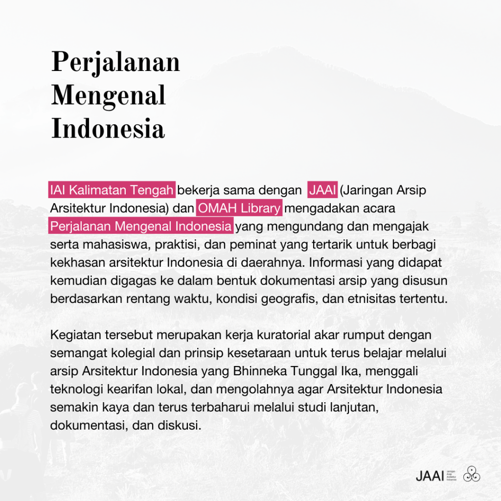 PMI mengundang dan mengajak serta mahasiswa, praktisi, dan peminat yang tertarik untuk berbagi kekhasan arsitektur Indonesia di daerahnya. Informasi yang didapat kemudian digagas ke dalam bentuk dokumentasi arsip yang disusun berdasarkan rentang waktu, kondisi geografis, dan etnisitas tertentu. IAI Kalimantan Tengah bersama JAAI dan Omah Library bercita-cita akan pergerakan yang turut memperkaya keindahan jejak emosi manusia dalam arsitektur, dan memberlanjutkan pengetahuan, kecakapan dan kecerlangan lokal Arsitektur Indonesia.