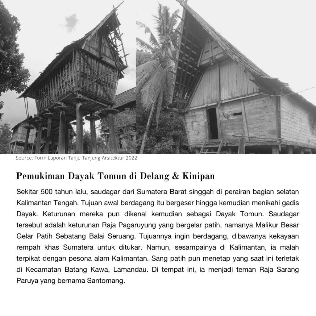 Permukiman Dayak Tomun di Delang dan Kinipan memiliki sejarah budaya yang cukup panjang, begitu juga pengaruh terhadap adat istiadat maupun akulturasi budaya yang terjadi. Di daerah Delang, masyarakat didominasi oleh suku Dayak Tomun yang menurut sejarahnya berasal dari tanah Minangkabau. Hal ini dibuktikan antara lain dari dialek bahasa, musik lokal. Lalu, bagaimana dengan rumah tinggalnya? Apakah juga ada pengaruh dari Minangkabau?