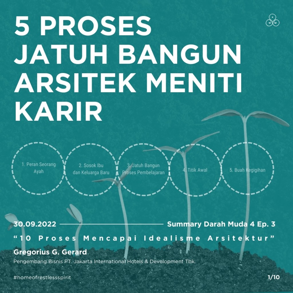 Proses seorang arsitek mencapai idealismenya membutuhkan waktu dan kesabaran, di dalam perjalanannya, setiap calon arsitek menjalani begitu banyak tahapan. Kali ini Gregorius menjalani 10 tahap idealisme arsitektur dengan menulis, berdiskusi, aktif di badan kemahasiswaan, perpustakaan, biro arsitektur, organisasi, bisnis, serta developer, membuatnya bertemu dengan banyak orang dan membentuk ekosistem yang saling mendukung. Gregorius merefleksikannya bagai sebuah perjalanan naik gunung. Layaknya naik gunung, adanya support ekosistem menjadi penyemangat dan menuntun secara bertahap dari tahap satu dan 9 tahap selanjutnya. Omah Library mengajak untuk mendiskusikan bagaimana jika mempertanyakan apa yang bisa kita lakukan untuk terus menikmati prosesnya dan membentuk lompatan-lompatan baru darinya?