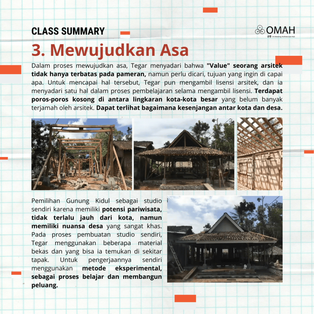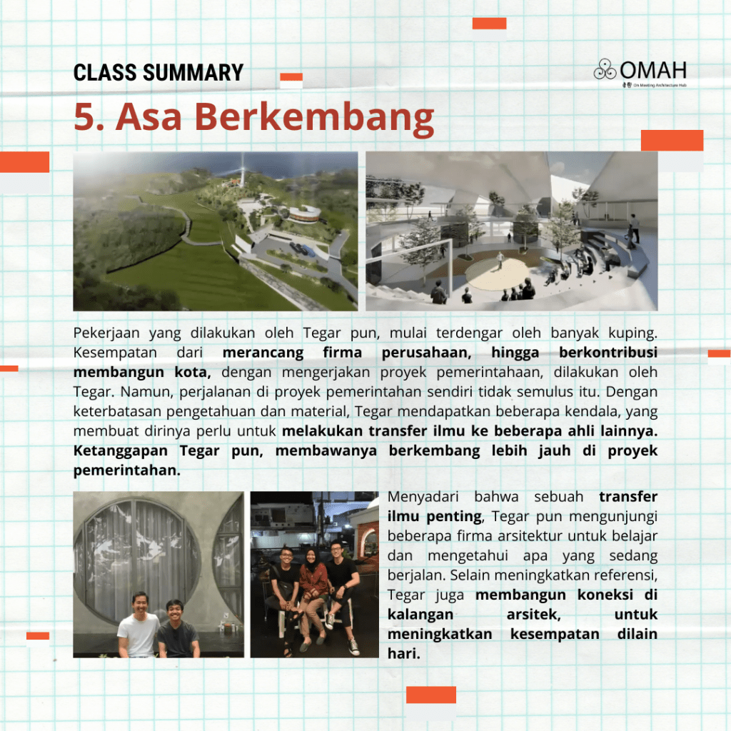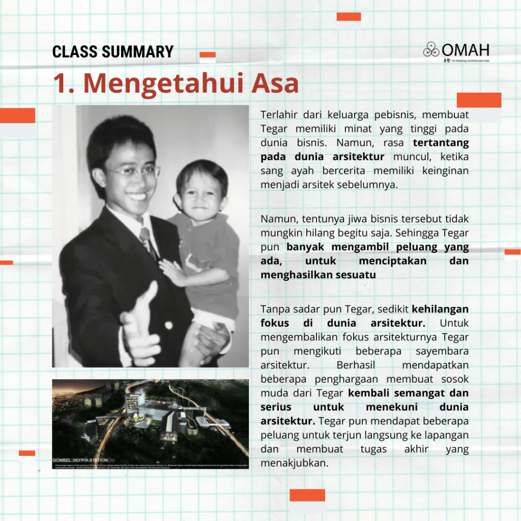 OMAH Library melalui Dara(h) Muda percaya bahwa arsitek-arsitek Indonesia seyogyanya tidak terlibat di dalam arsitektur yang itu-itu saja, tetapi terus menembus batas peran, kemampuan, dan merefleksikannya untuk bisa memperbaiki ekosistem arsitektur Indonesia bersama-sama. Simak perjalanan suka duka Tegar dalam mewujudkan asa, baik asa dirinya sendiri, maupun komunitas desa, mulai dari level tetangga, kelurahan, kecamatan, sampai di level kabupaten.