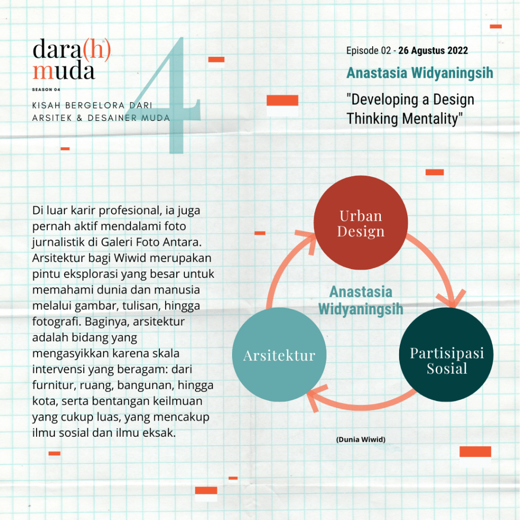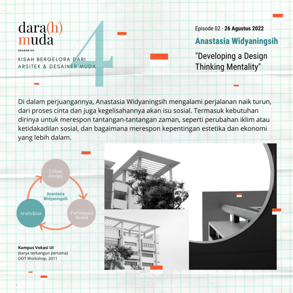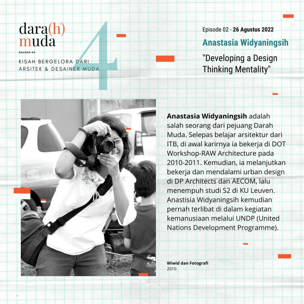 Dara(h) Muda adalah sebuah program yang sangat kami banggakan karena lewat acara ini kita bisa melihat sejauh mana kegelisahan anak-anak muda yang sungguh mencintai arsitektur di Indonesia. Banyak dari mereka memiliki kegelisahan dan perjuangan yang besar di dalam menunjukkan jati diri mereka. Namun, dalam hal berproses, mereka tidak bermain-main. Banyak dari mereka bekerja tidak hanya dalam lingkup batas arsitek dan arsitektur, tetapi juga di luar batas itu seperti tata kota. Anastasia Widyaningsih adalah salah seorang dari pejuang Darah Muda. Selepas belajar arsitektur dari ITB, a bekerja di DOT Workshop-RAW Architecture. Kemudian, a lanjut bekerja dan mendalami urban design di DP Architects dan AECOM, lalu menempuh studi S2 di KU Leuven. Wiwid juga pernah terlibat dalam kegiatan kemanusiaan (UNDP). Di luar karir profesionalnya, a juga pernah aktif mendalami foto jurnalistik di Galeri Foto Antara.