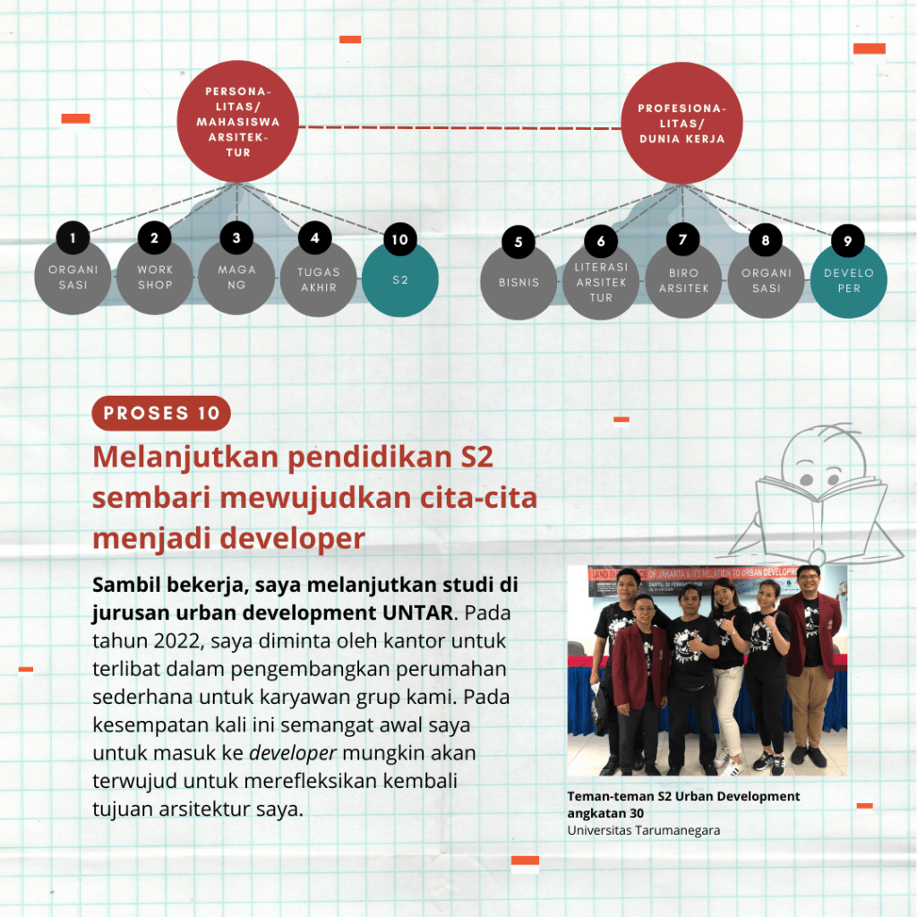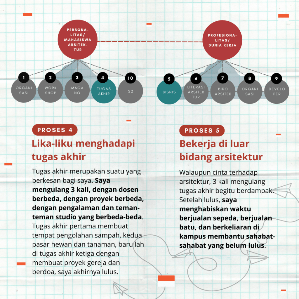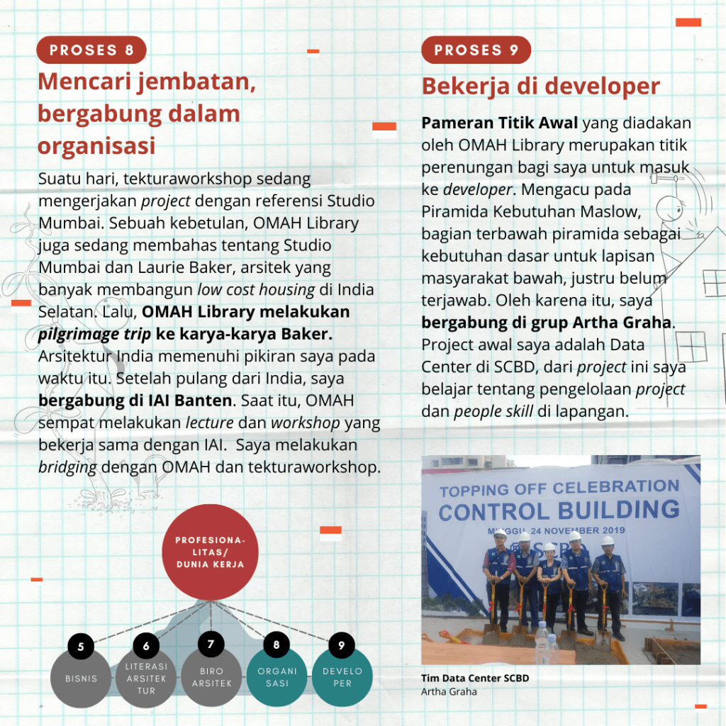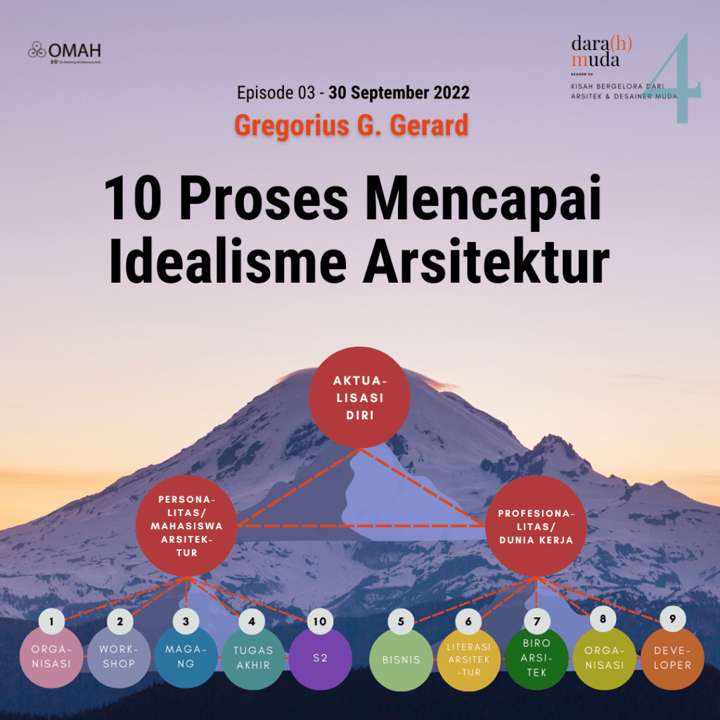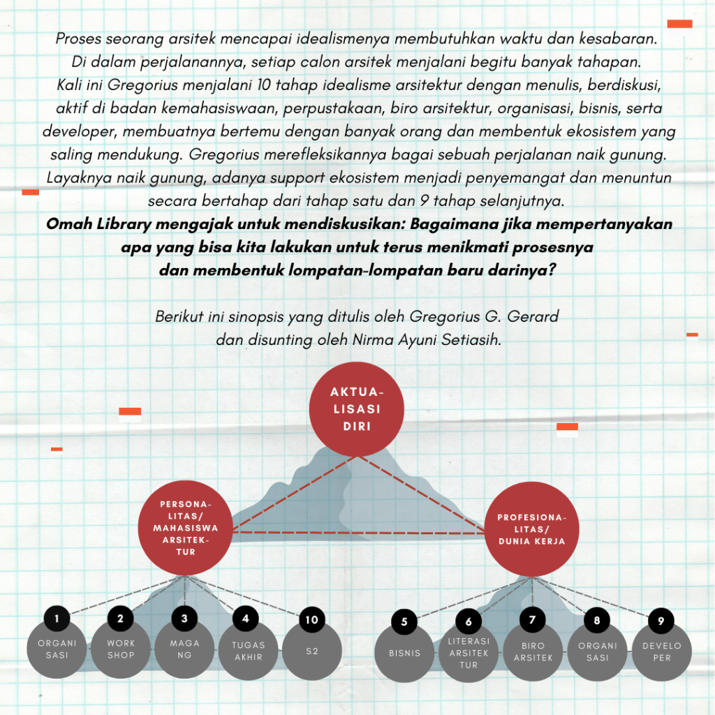 Proses seorang arsitek mencapai idealismenya membutuhkan waktu dan kesabaran, di dalam perjalanannya, setiap calon arsitek menjalani begitu banyak tahapan. Kali ini Gregorius menjalani 10 tahap idealisme arsitektur dengan menulis, berdiskusi, aktif di badan kemahasiswaan, perpustakaan, biro arsitektur, organisasi, bisnis, serta developer, membuatnya bertemu dengan banyak orang dan membentuk ekosistem yang saling mendukung. Gregorius merefleksikannya bagai sebuah perjalanan naik gunung. Layaknya naik gunung, adanya support ekosistem menjadi penyemangat dan menuntun secara bertahap dari tahap satu dan 9 tahap selanjutnya. Omah Library mengajak untuk mendiskusikan bagaimana jika mempertanyakan apa yang bisa kita lakukan untuk terus menikmati prosesnya dan membentuk lompatan-lompatan baru darinya?
