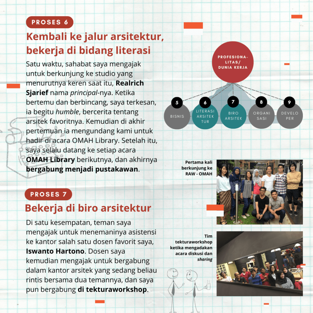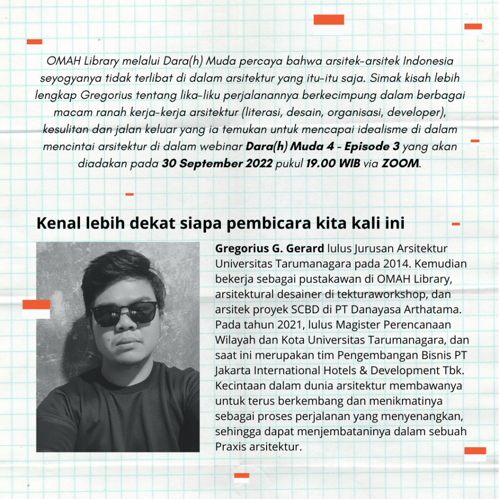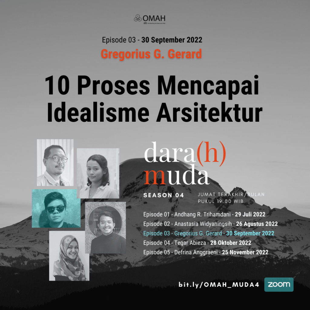 Dari kisah-kisah yang dialami oleh Gregorius dan pembicara sesi Dara (h) Muda lainnya, OMAH Library percaya bahwa arsitek-arsitek Indonesia seyogyanya tidak terlibat di dalam skup arsitektur yang terbatas namun terus menembus batas peran, kemampuan, dan merefleksikannya untuk bisa memperbaiki ekosistem arsitektur Indonesia bersama-sama.