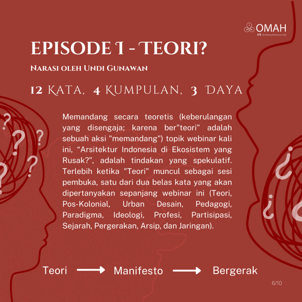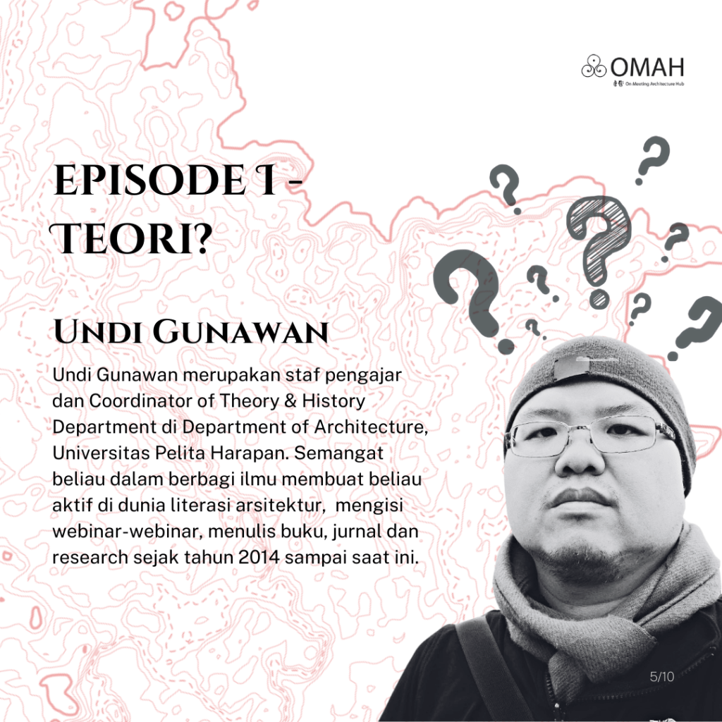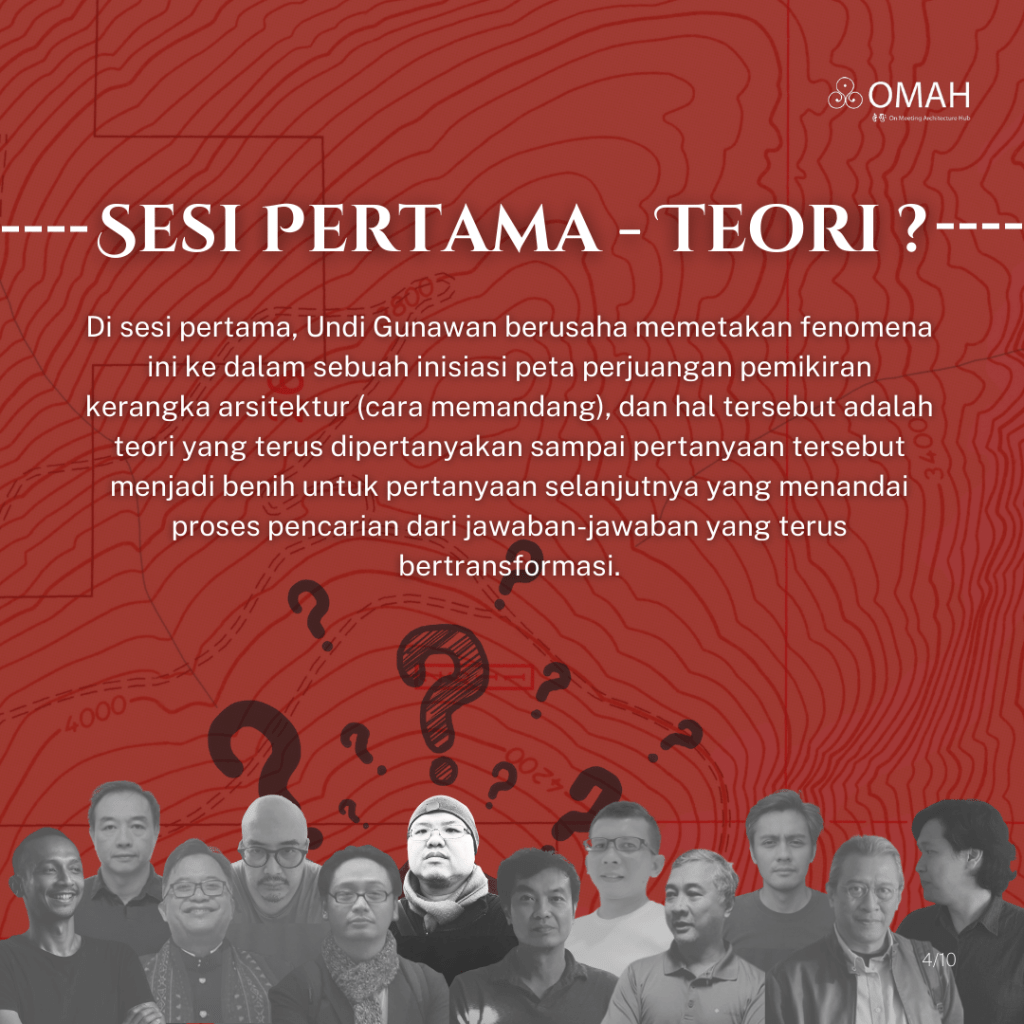 Di sesi pertama, Undi Gunawan berusaha memetakan fenomena ini ke dalam sebuah inisiasi peta perjuangan pemikiran kerangka arsitektur (cara memandang), dan hal tersebut adalah teori yang terus dipertanyakan sampai pertanyaan tersebut menjadi benih untuk pertanyaan selanjutnya yang menandai proses pencarian dari jawaban-jawaban yang terus bertransformasi.