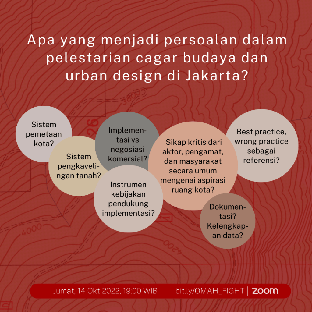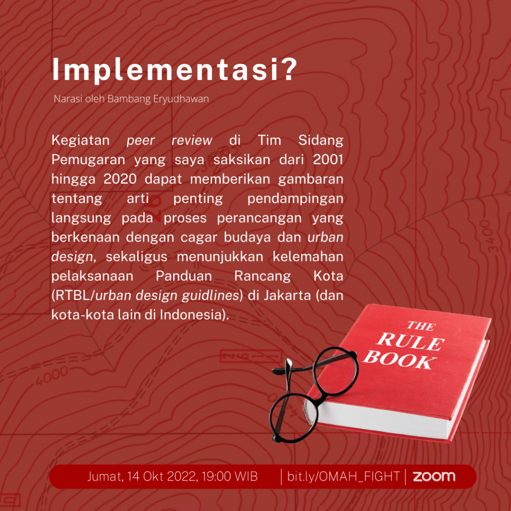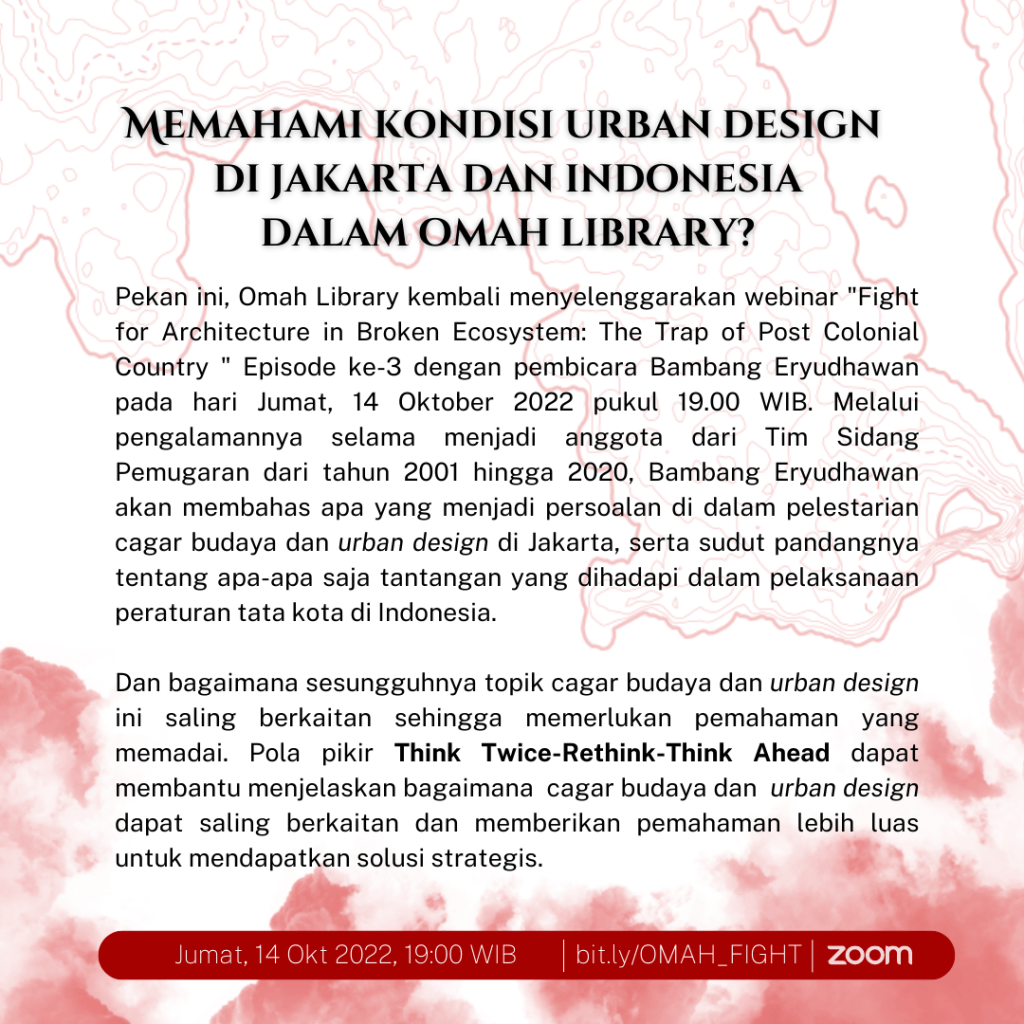 Pekan ini, Omah Library kembali menyelenggarakan webinar “Fight for Architecture in Broken Ecosystem: The Trap of Post Colonial Country ” Episode ke-3 dengan pembicara Bambang Eryudhawan pada hari Jumat, 14 Oktober 2022 pukul 19.00 WIB. Melalui pengalamannya selama menjadi anggota dari Tim Sidang Pemugaran dari tahun 2001 hingga 2020, Bambang Eryudhawan akan membahas apa yang menjadi persoalan di dalam pelestarian cagar budaya dan urban design di Jakarta, serta sudut pandangnya tentang apa-apa saja tantangan yang dihadapi dalam pelaksanaan peraturan tata kota di Indonesia.