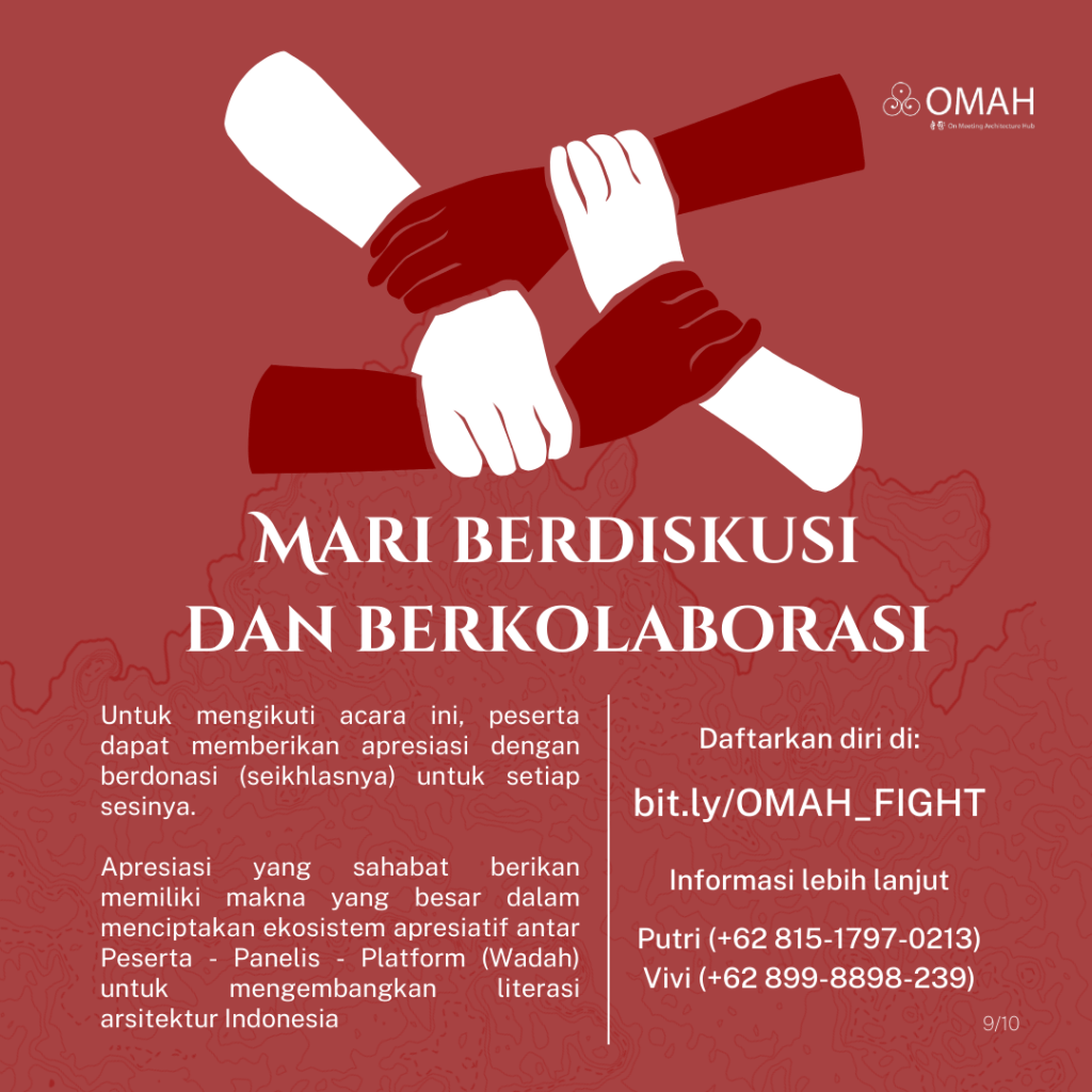 Untuk mengikuti acara ini, peserta dipersilakan untuk memberikan apresiasi dengan berdonasi (seikhlasnya) untuk setiap sesinya. Apresiasi yang sahabat berikan memiliki makna yang besar dalam menciptakan ekosistem apresiatif antara Peserta – Panelis – Platform (Wadah) untuk pengembangan literasi arsitektur Indonesia.