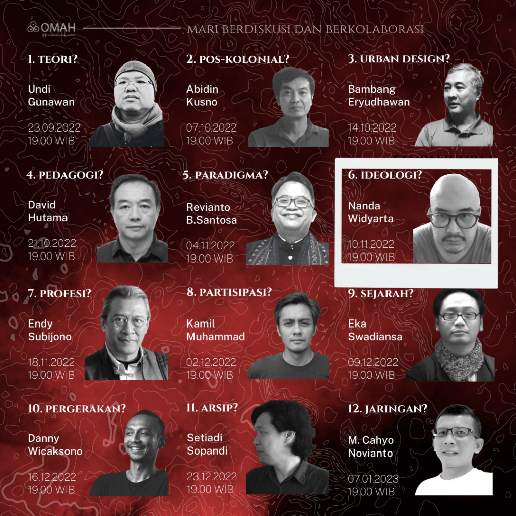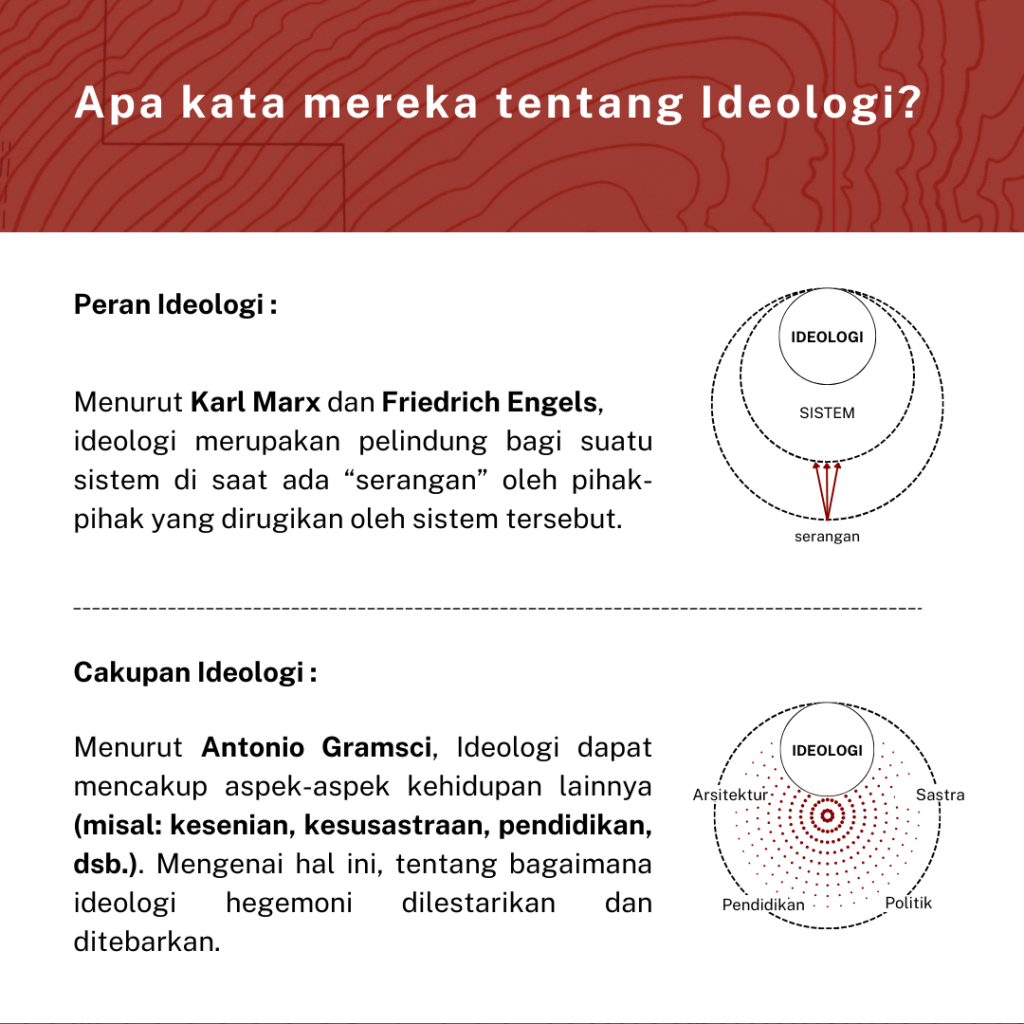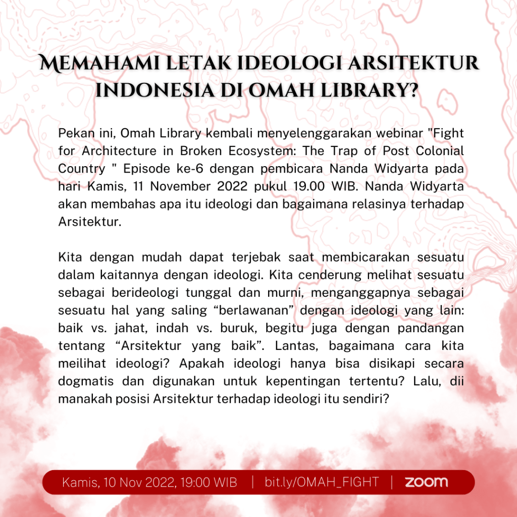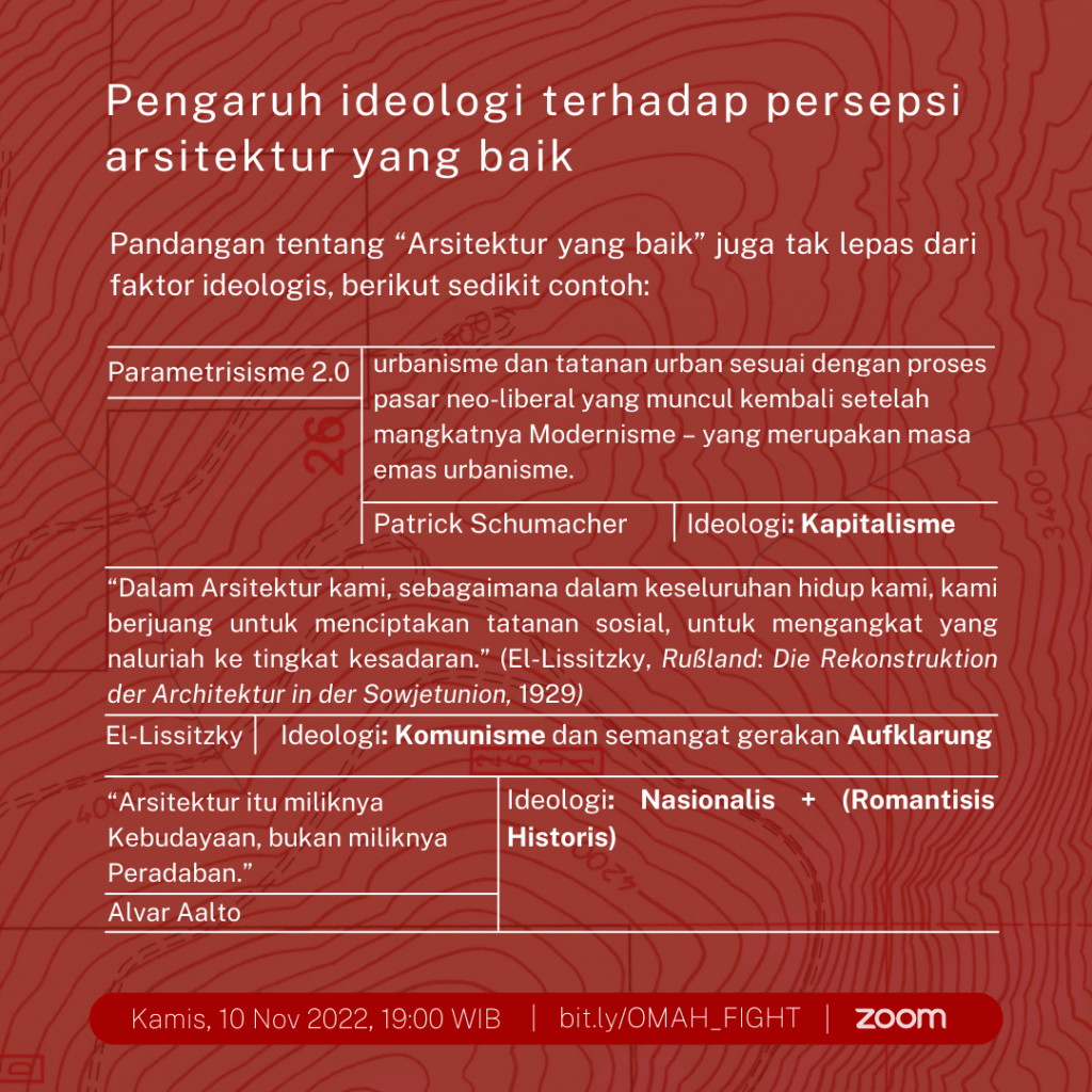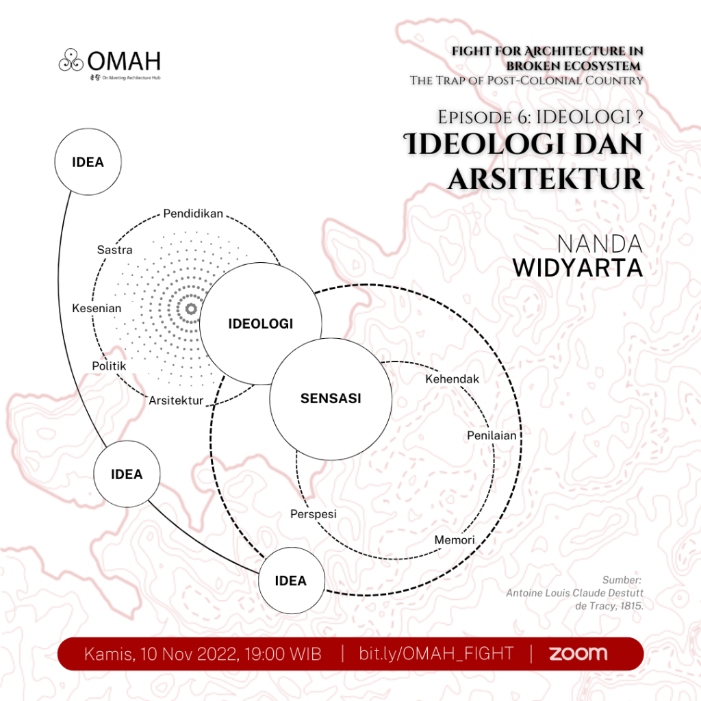 Kita dengan mudah dapat terjebak saat membicarakan sesuatu dalam kaitannya dengan ideologi. Kita cenderung melihat sesuatu sebagai berideologi tunggal dan murni, menganggapnya sebagai sesuatu hal yang saling “berlawanan” dengan ideologi yang lain: baik vs. jahat, indah vs. buruk, begitu juga dengan pandangan tentang “Arsitektur yang baik”. Lantas, bagaimana cara kita meilihat ideologi? Apakah ideologi hanya bisa disikapi secara dogmatis dan digunakan untuk kepentingan tertentu? Lalu, di manakah posisi Arsitektur terhadap ideologi itu sendiri?