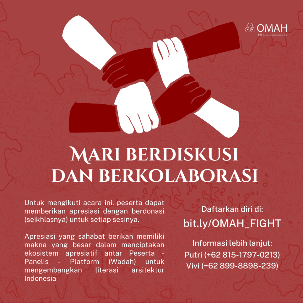 Untuk mengikuti acara ini, peserta dipersilakan untuk memberikan apresiasi dengan berdonasi (seikhlasnya) untuk setiap sesinya. Apresiasi yang sahabat berikan memiliki makna yang besar dalam menciptakan ekosistem apresiatif antara Peserta – Panelis – Platform (Wadah) untuk pengembangan literasi arsitektur Indonesia.