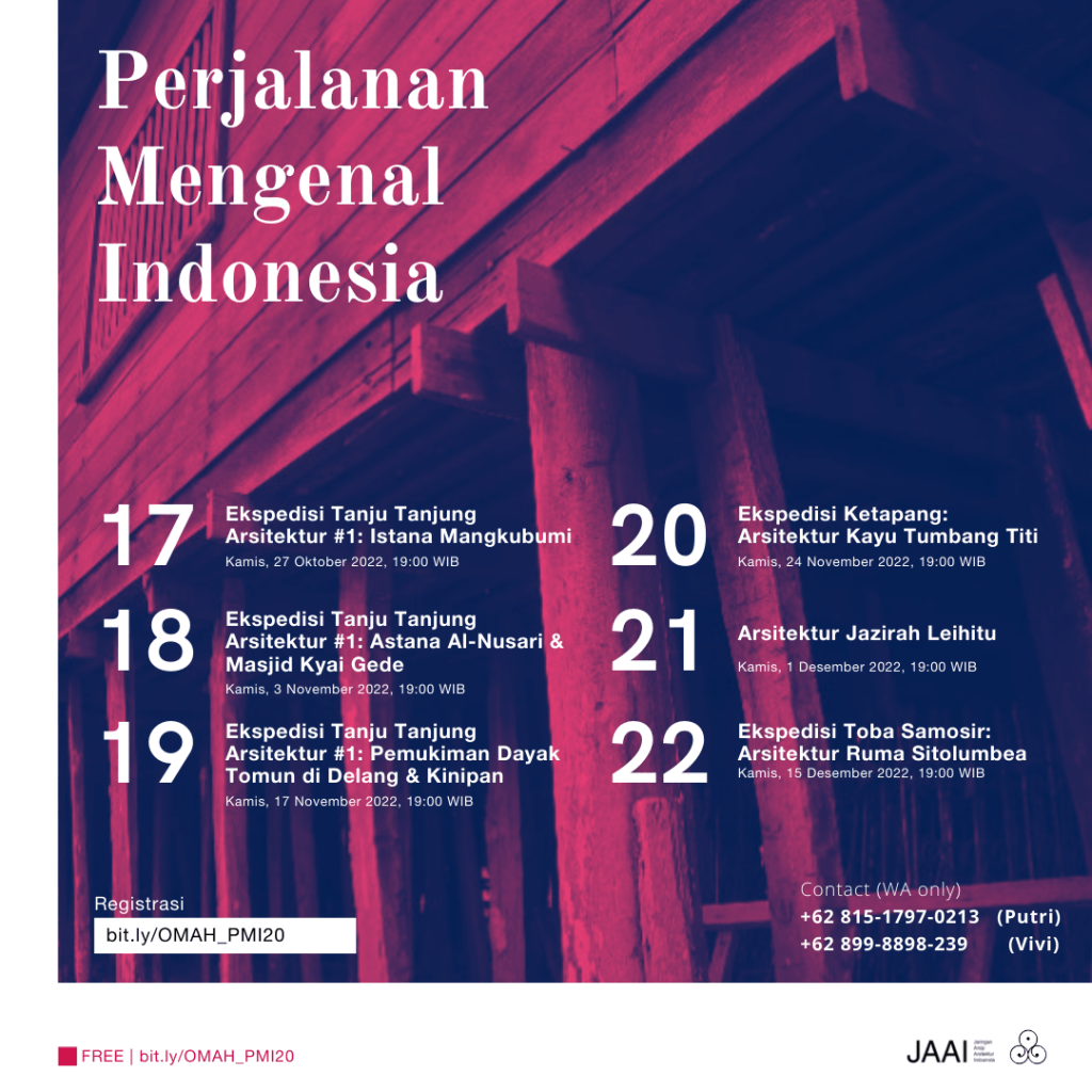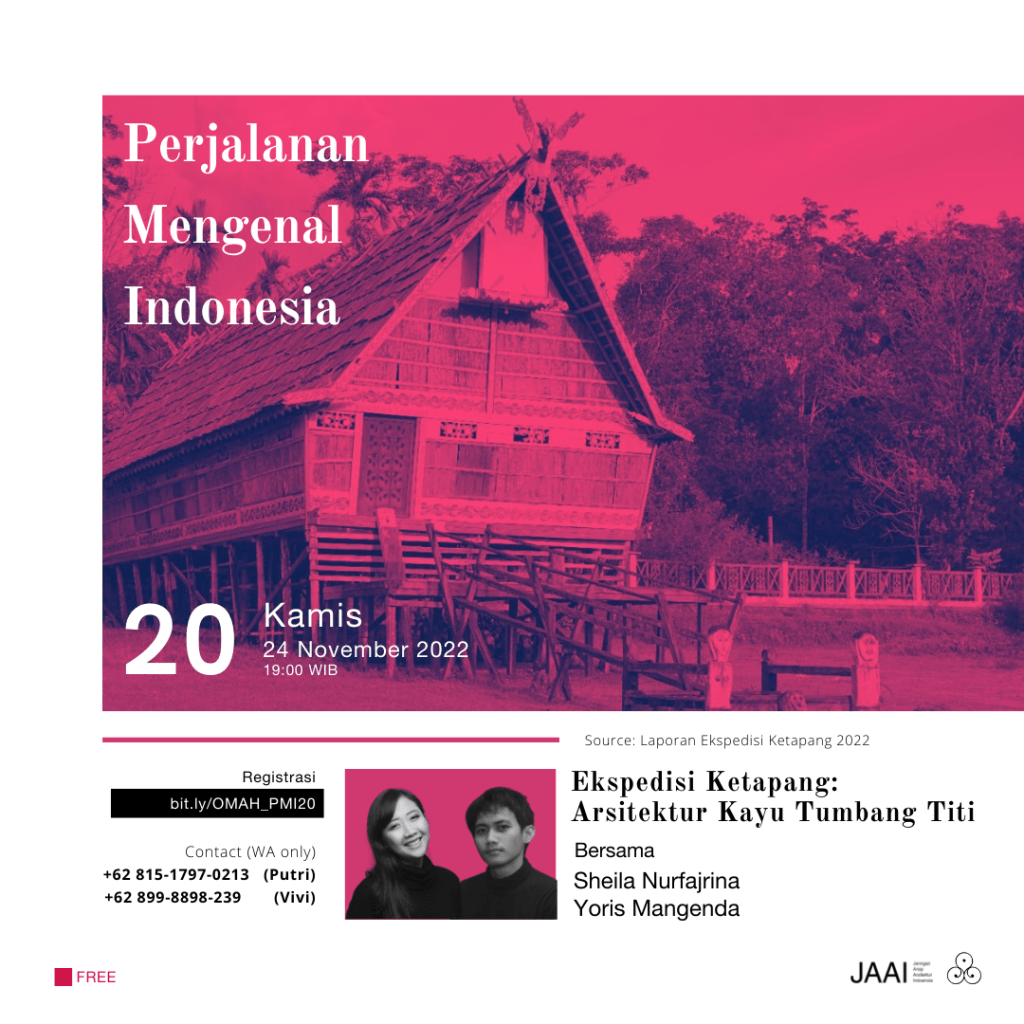 Setelah minggu lalu menjadi pekan terakhir PMI kolaborasi dengan IAI Kalimantan Tengah, sinergi JAAI dan Omah Library terus berlanjut dengan PMI-20 yang kali ini akan membicarakan tentang Arsitektur Kayu Tumbang Titi, Kabupaten Ketapang, Kalimantan Barat.
