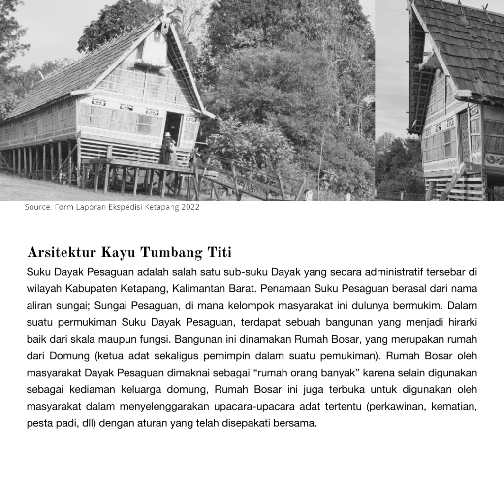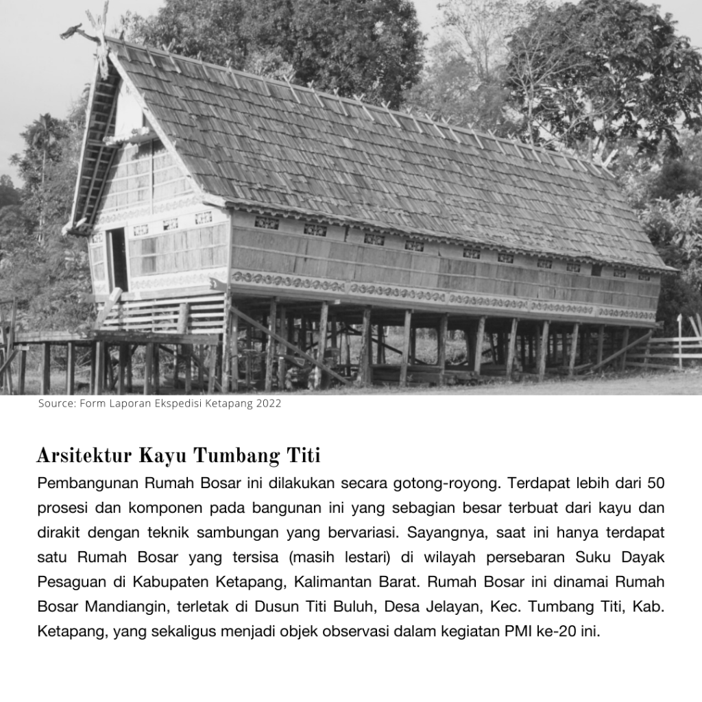 Suku Dayak Pesaguan adalah salah satu sub-suku Dayak yang secara administratif tersebar di wilayah Kabupaten Ketapang, Kalimantan Barat. Dalam suatu permukiman suku Dayak Pesaguan, terdapat sebuah bangunan yang menjadi hirarki baik dari skala maupun fungsi. Bangunan ini dinamakan Rumah Bosar, yang merupakan rumah dari Domung (ketua adat sekaligus pemimpin dalam suatu pemukiman). Rumah Bosar oleh masyarakat Dayak Pesaguan dimaknai sebagai “rumah orang banyak”. Pembangunan Rumah Bosar ini dilakukan secara gotong-royong, Rumah Bosar ini dinamai Rumah Bosar Mandiangin yang terletak di Dusun Titi Buluh, Desa Jelayan, Kec. Tumbang Titi, Kab. Ketapang, yang sekaligus menjadi objek observasi dalam kegiatan PMI ke-20 ini.