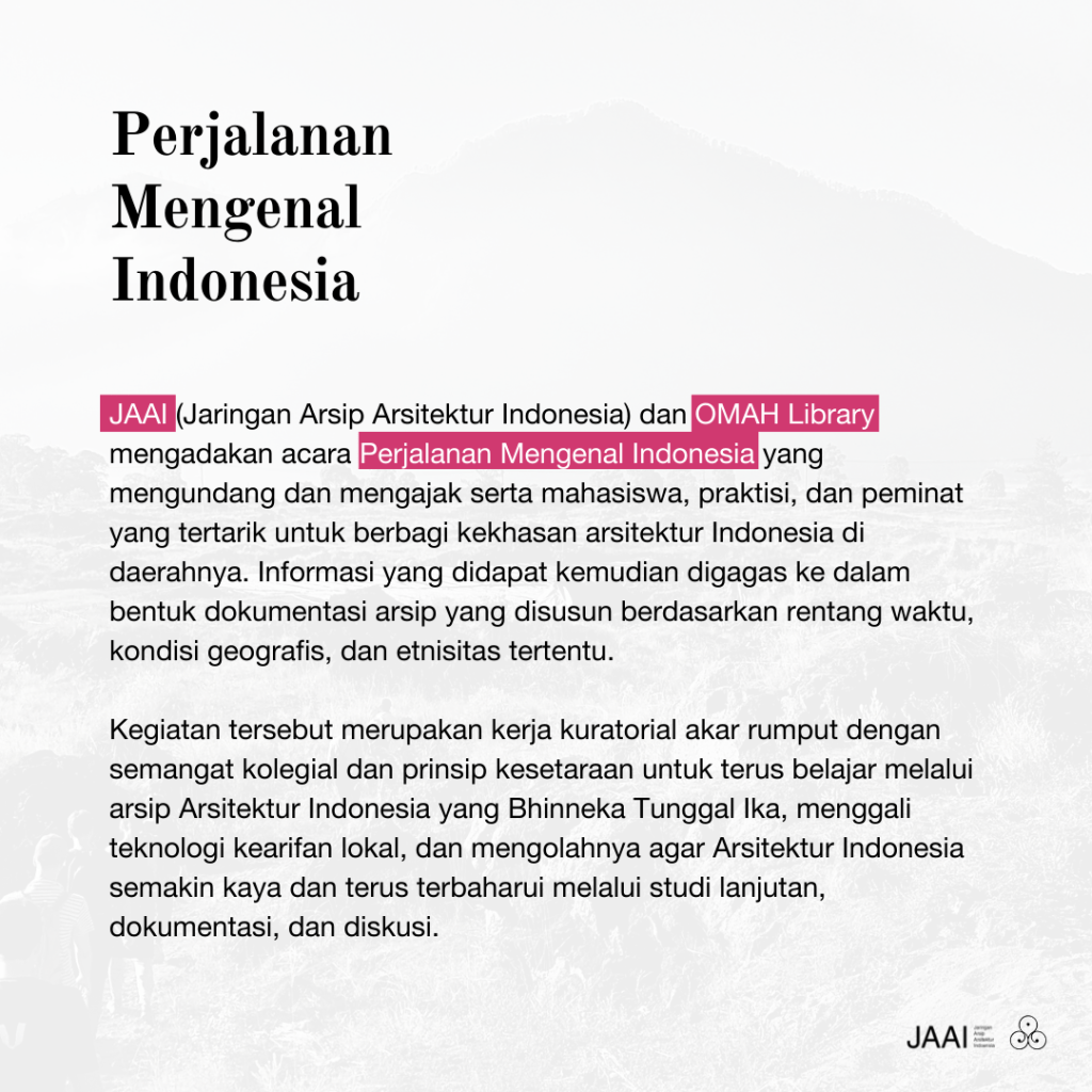 PMI mengundang dan mengajak serta mahasiswa, praktisi, dan peminat yang tertarik untuk berbagi kekhasan arsitektur Indonesia di daerahnya. Informasi yang didapat kemudian digagas ke dalam bentuk dokumentasi arsip yang disusun berdasarkan rentang waktu, kondisi geografis, dan etnisitas tertentu. JAAI dan Omah Library bercita-cita akan pergerakan yang turut memperkaya keindahan jejak emosi manusia dalam arsitektur, dan memberlanjutkan pengetahuan, kecakapan dan kecerlangan lokal Arsitektur Indonesia.