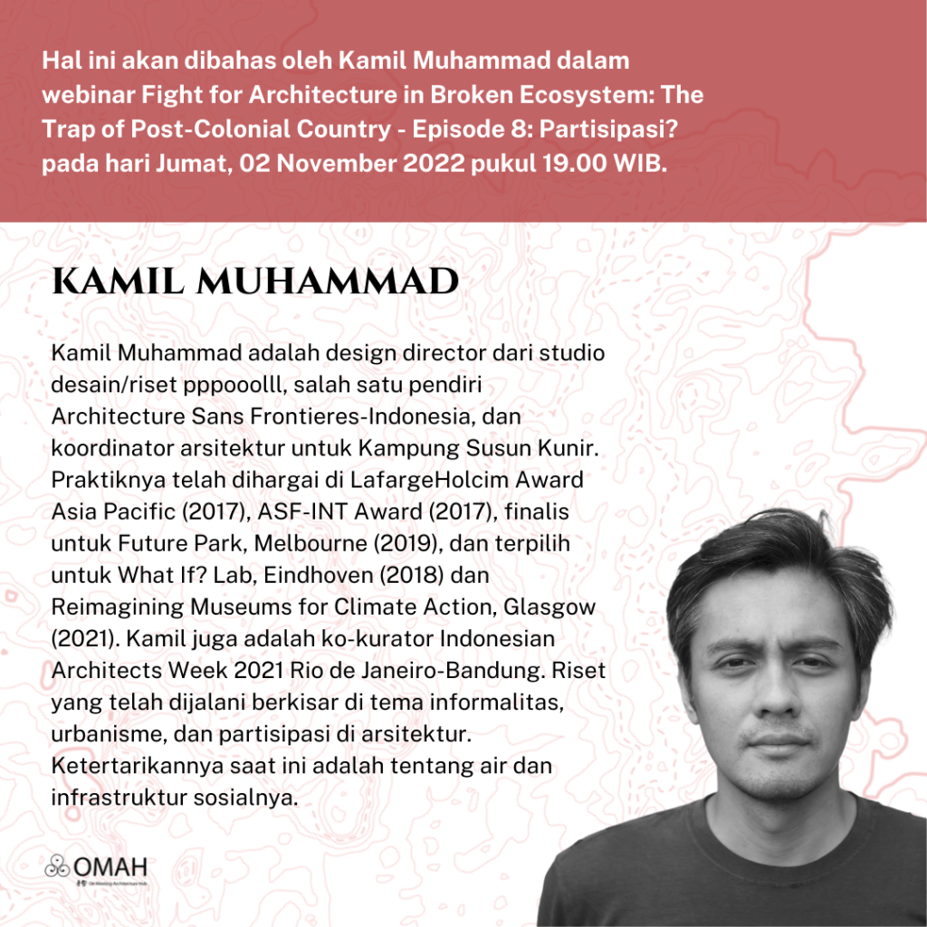 Pekan ini, Omah Library kembali menyelenggarakan webinar “Fight for Architecture in Broken Ecosystem: The Trap of Post Colonial Country ” Episode ke-8 dengan pembicara Kamil Muhammad pada hari Jumat, 02 Desember 2022 pukul 19.00 WIB. Kamil Muhammad adalah design director dari studio desain/riset pppooolll, koordinator arsitektur untuk Kampung Susun Kunir, dan juga salah satu pendiri Architecture Sans Frontieres-Indonesia. Sebagai seorang arsitek, Kamil telah menjalani riset yang berkaitan dengan informalitas, urbanisme, dan partisipasi arsitektur. Saat ini ia mengarahkan fokus risetnya terhadap air dan infrastruktur sosialnya.