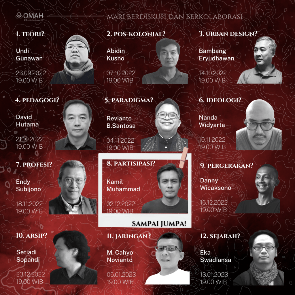 Melalui pengalaman risetnya, Kamil Muhammad akan membahas tentang apa itu partisipasi, pendampingan partisipasi hingga ke dalam kritik terhadap partisipasi. Bagaimana “partisipasi” terjadi dalam konteks praktik arsitektur? Kenapa “partisipasi”, dan bukan “gotong royong”? Apa maksud dari “pendampingan warga” di sini?