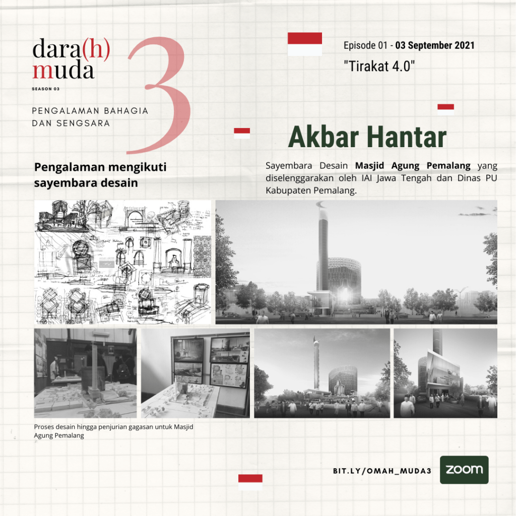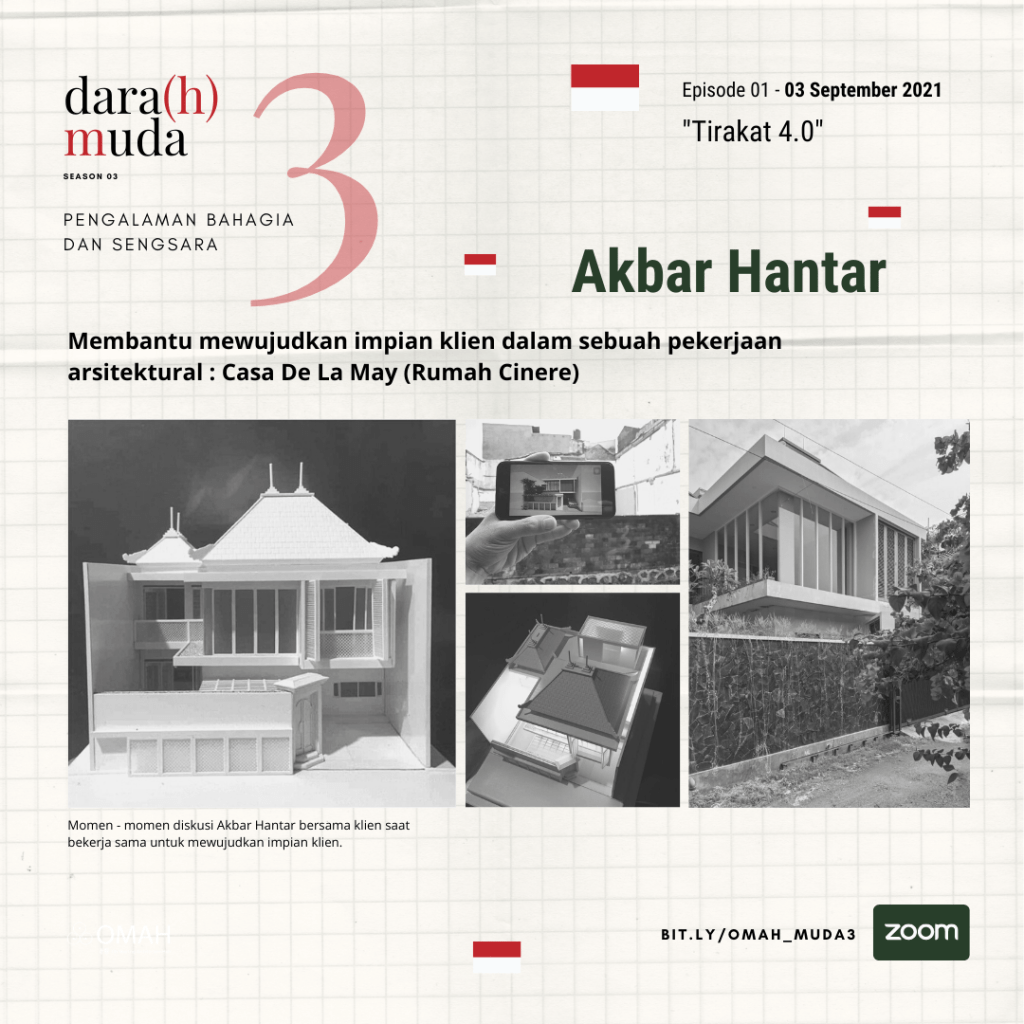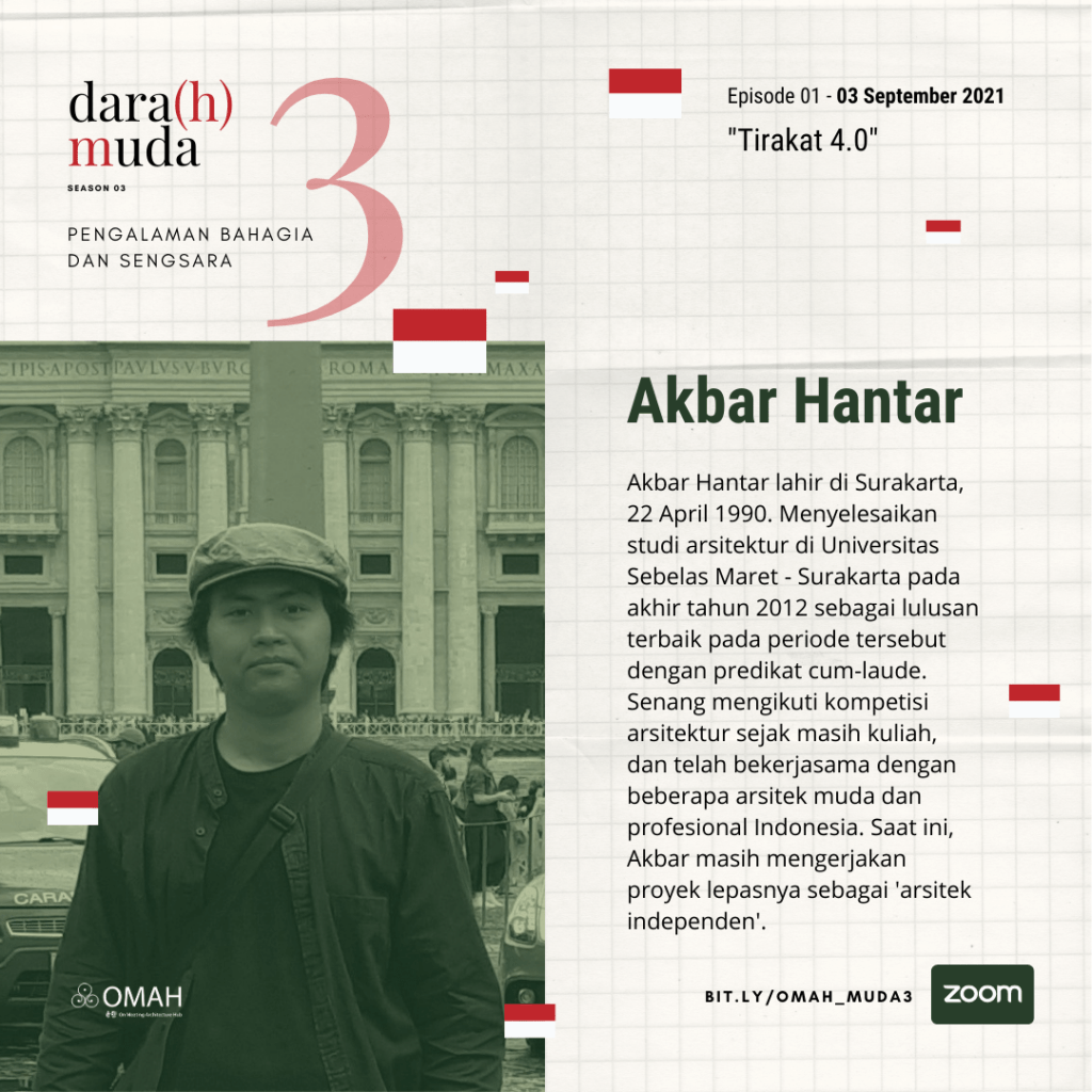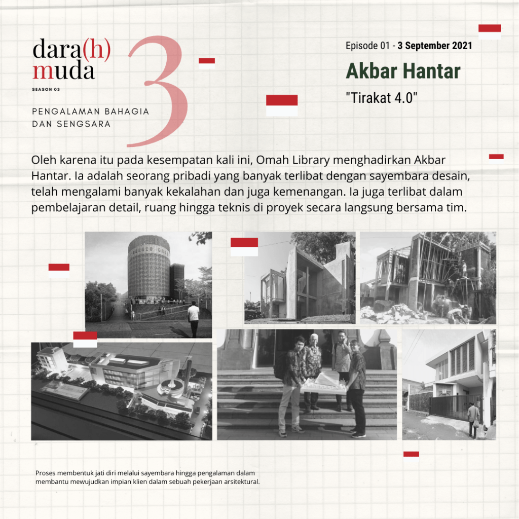 Salah satu tolak ukur kemahiran seorang arsitek ditentukan oleh jam terbang dalam menyelesaikan masalah arsitektural. Sehingga untuk mendapatkan pengalaman, kita bisa belajar dari perjalanan yang dibagikan dengan jujur oleh sang arsitek. Pengalaman ini bukan hanya glorifikasi ataupun cerita – cerita hebat namun juga cerita – cerita di balik layar yang menyentuh hati. Kali ini Omah Library berkesempatan menghadirkan Akbar Hantar. Ia adalah seorang pribadi yang banyak terlibat dengan sayembara desain, mengalami banyak kekalahan dan juga kemenangan. Ia juga terlibat dalam pembelajaran detail, ruang, teknis di proyek langsung bersama tim.