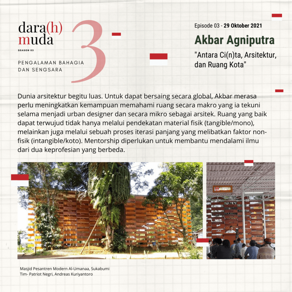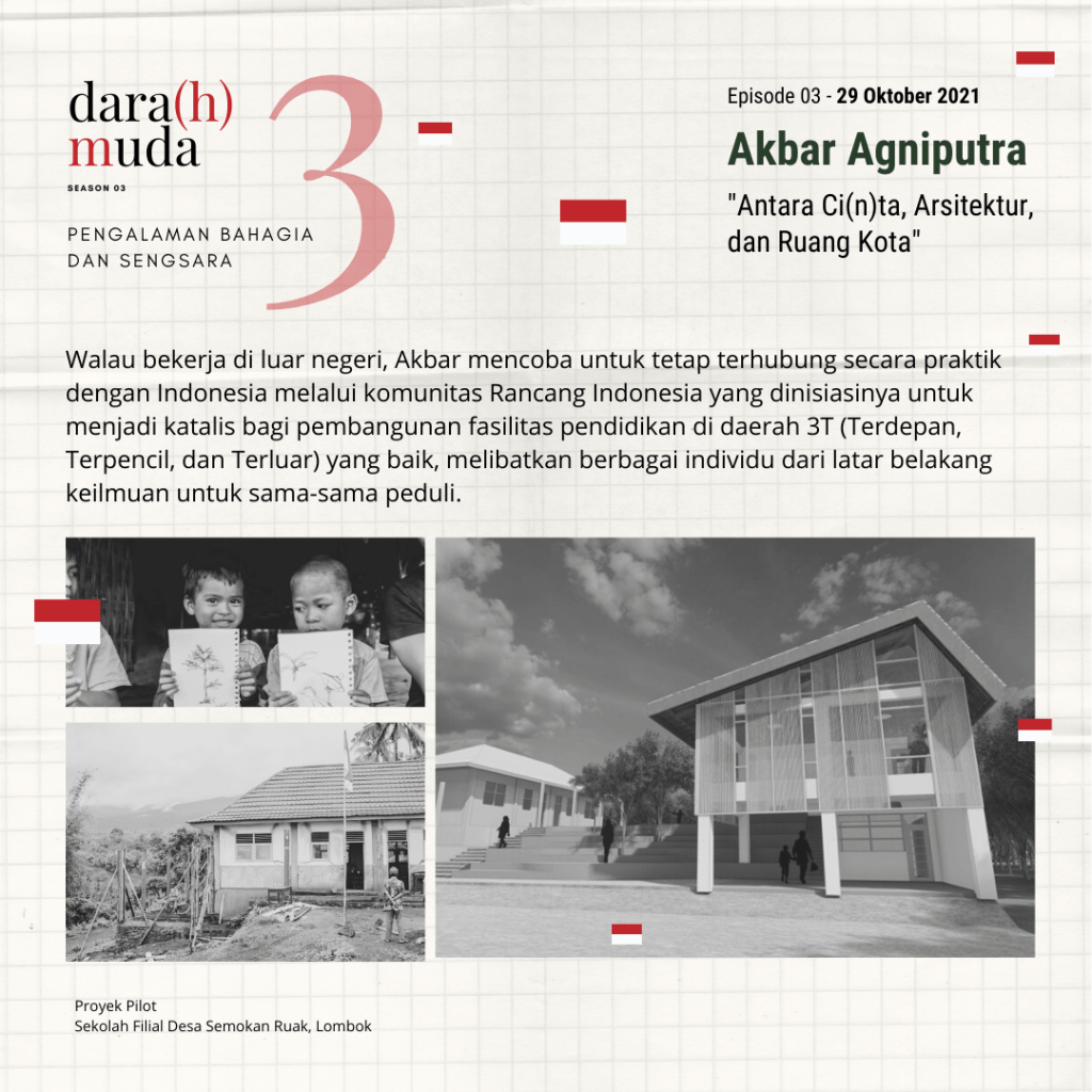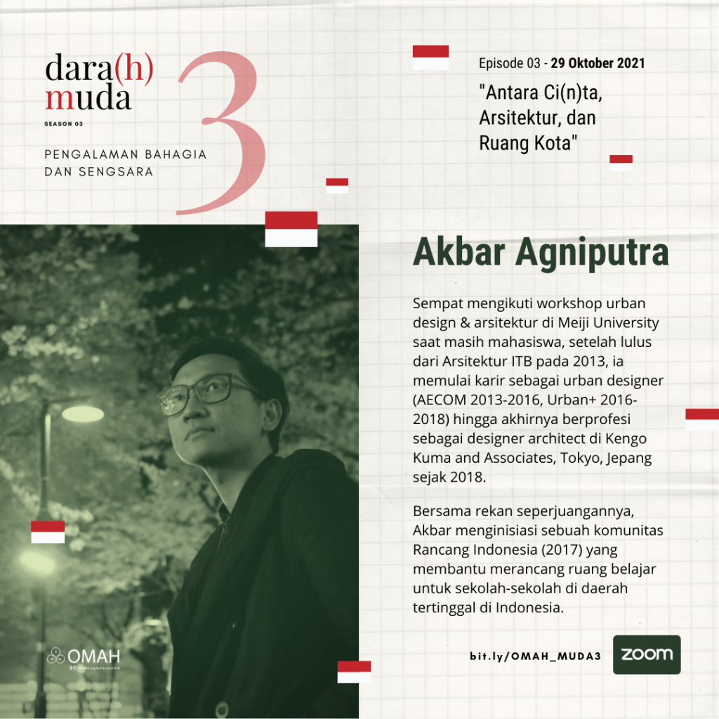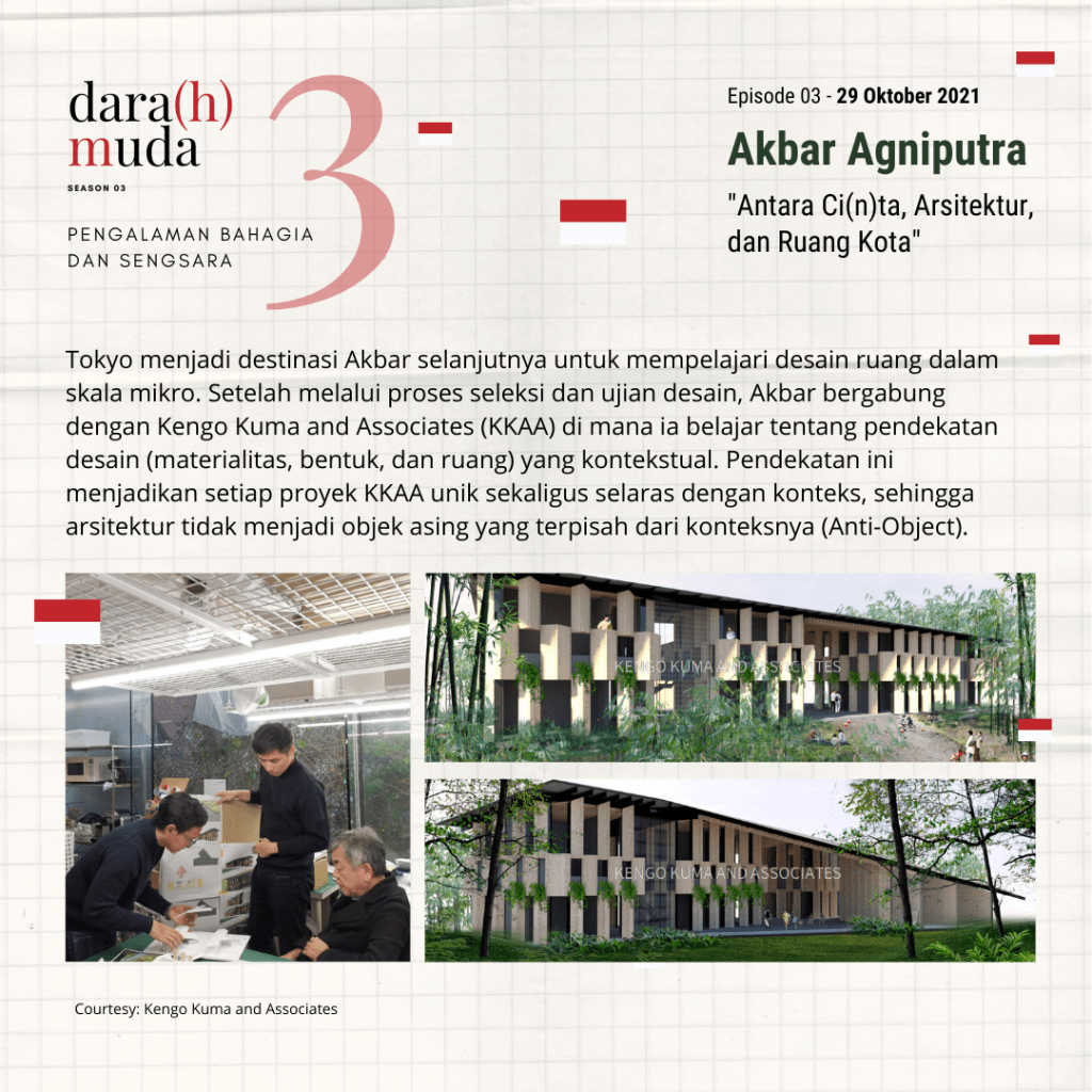 Sebelum lulus dari jurusan Arsitektur ITB pada tahun 2013, Akbar Agniputra mendapatkan beasiswa untuk mengikuti workshop internasional urban design dan arsitektur di Meiji University, Tokyo, Jepang, pada tahun yang sama. Selanjutnya ia memulai karir sebagai urban designer (AECOM 2013-2016, Urban+ 2016-2018) hingga akhirnya berprofesi sebagai designer architect di Kengo Kuma…