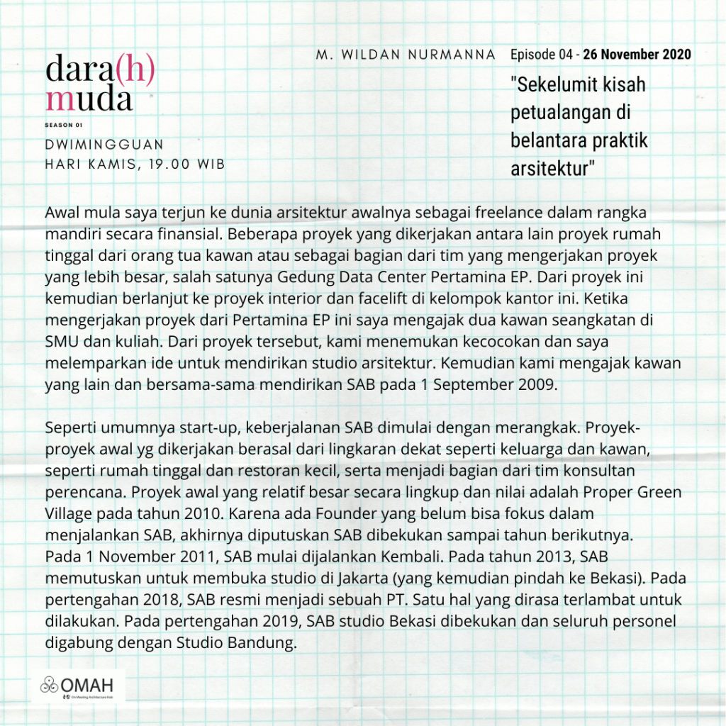 “Darah muda, darahnya para remaja… Masa muda masa yang berapi-api…” Kalau sudah mendengar bait ini, artinya telah tiba waktunya bagi kita untuk menyimak kembali kisah-kisah bergelora arsitek muda dalam season kedua Dara(h) Muda..OMAH Library dengan bangga menyajikan enam episode di season ini ditemani arsitek-arsitek muda dengan kisah-kisahnya yang khas tentang…